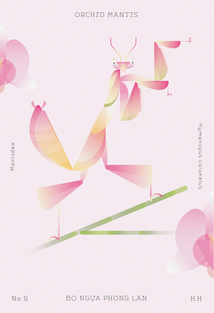 Vietnamlı sanatçı, grafik tasarımcı ve illüstratör Hoàng Hoàng, The Insect World Collection projesinde minimalist bir estetikle böcekleri yaşam alanlarında tasvir etmiş. Kimileri için ürkütücü olan yaban arısı dahi insanın gözünü alamadığı muhteşem bir tabloya dönüşmüş. Böceklerin halk dilindeki isimlerinin yanı sıra bilimsel isimleri ve bunların Vietnam dilindeki karşılığı da arka plana eklenmiş. Seride; eşek arısı, çekirge, peygamber devesi, helikopter böceği, yürüyen yaprak ve uğur böceği olmak üzere toplam 6 farklı böcek yer alıyor. Kullanılan dijital araç ise Adobe Illustrator.