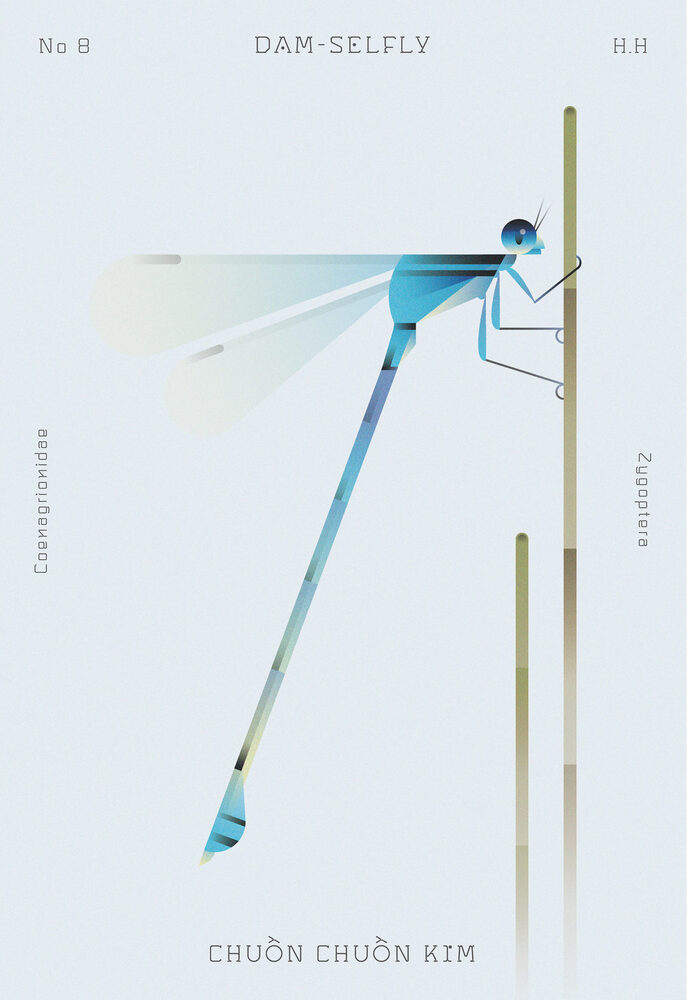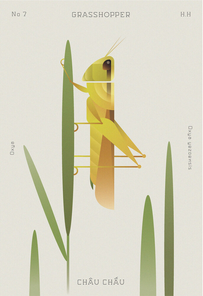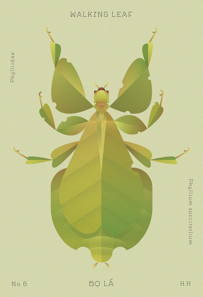 Vietnamlı sanatçı, grafik tasarımcı ve illüstratör Hoàng Hoàng, The Insect World Collection projesinde minimalist bir estetikle böcekleri yaşam alanlarında tasvir etmiş. Kimileri için ürkütücü olan yaban arısı dahi insanın gözünü alamadığı muhteşem bir tabloya dönüşmüş. Böceklerin halk dilindeki isimlerinin yanı sıra bilimsel isimleri ve bunların Vietnam dilindeki karşılığı da arka plana eklenmiş. Seride; eşek arısı, çekirge, peygamber devesi, helikopter böceği, yürüyen yaprak ve uğur böceği olmak üzere toplam 6 farklı böcek yer alıyor. Kullanılan dijital araç ise Adobe Illustrator.