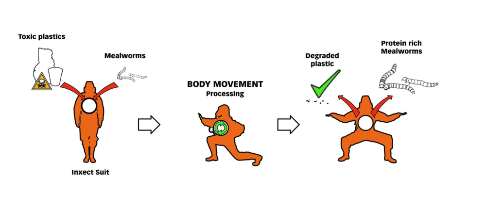 Inxect Suit, plastik atıkları yenilebilir proteinlere ayıran düşük karbon ayak izine sahip giyilebilir bir rejeneratif cihaz. İçinde insan vücut ısısıyla korunan plastik atıkları tüketen yemek kurdu kolonilerini barındırıyor. Protein açısından oldukça zengin olan yemek kurtları, toksik plastiği herhangi bir zarar görmeden yeme ve sindirme yeteneğine sahip. Stanford Üniversitesi’nden araştırmacılar 2019 yılında yürütülen bir çalışmada, yemek kurtlarının vücutlarında herhangi bir toksik bileşen depolamadan plastikleri güvenli bir şekilde yeme ve sindirme yeteneğine sahip olduğunu buldular. Diğer bir ifadeyle söz konusu iki özellik yemek kurtlarını hem sürdürülebilirliği en yüksek protein kaynakları hem de hızla büyüyen plastik atık sorunu için ideal bir çözüm kaynağı haline getiriyor.
