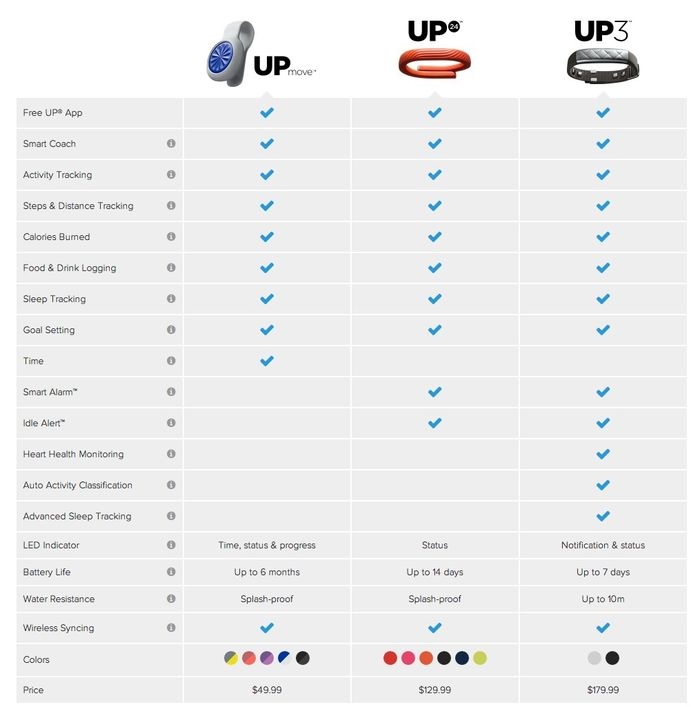 Jawbone açıkladığı üç model ile farklı fiyat aralıklarıyla sağlık durumunuzu kontrol ve denetim altında tutuyor. UP Move; fiziksel aktivitelerinizi, aldığınız besin değerlerinizi ve uyku kalitenizi takip ediyor. UP 24; bu özelliklerin yanı sıra uyku düzeninize uygun alarm ve pasif hareketlerinizi tespit edip harekete teşvik eden Idle Alert özelliği bulunuyor. En gelişmiş giyilebilir bileklik olan UP3 ise; kalp sağlığı, aktif uyku düzeni takibi ve otomatik aktivite sınıflandırması yapıyor.