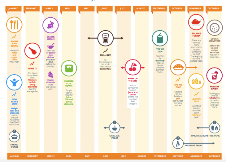 Google, 2014 arama datalarından yola çıkarak kulanıcıların yeme içme ve pişirme trendlerini ortaya çıkaran bir infografik oluşturmuş. İnfografiğe göre Ocak ayında insanlar Paleo tipi beslenme trendine ve yeni yıl diyetine oldukça rağbet göstermiş. Şubat ayında ise Super Bowl ile birlikte normal bir günden 9 kat daha fazla tavuk kanadı aranmış.