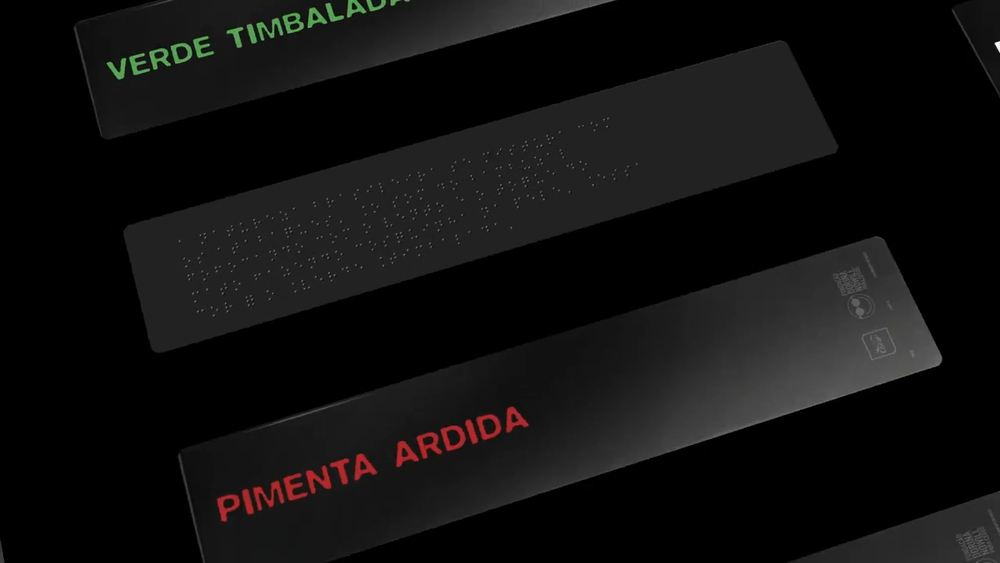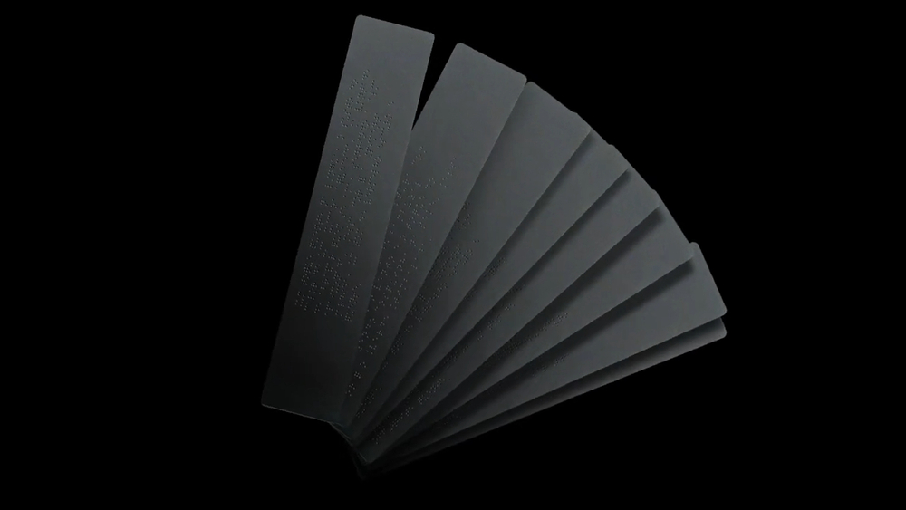 Proje kapsamında hazırlanan her örnek kartın ön yüzünde Braille yazısı, arka yüzünde ise büyük formatlı baskı yer alıyor ve tüm bunlar Coral’ın paletinde dokunsal bir rehber oluşturuyor. Kontrastı vurgulamak için tüm malzemeler siyah renkte sunulmuş.
