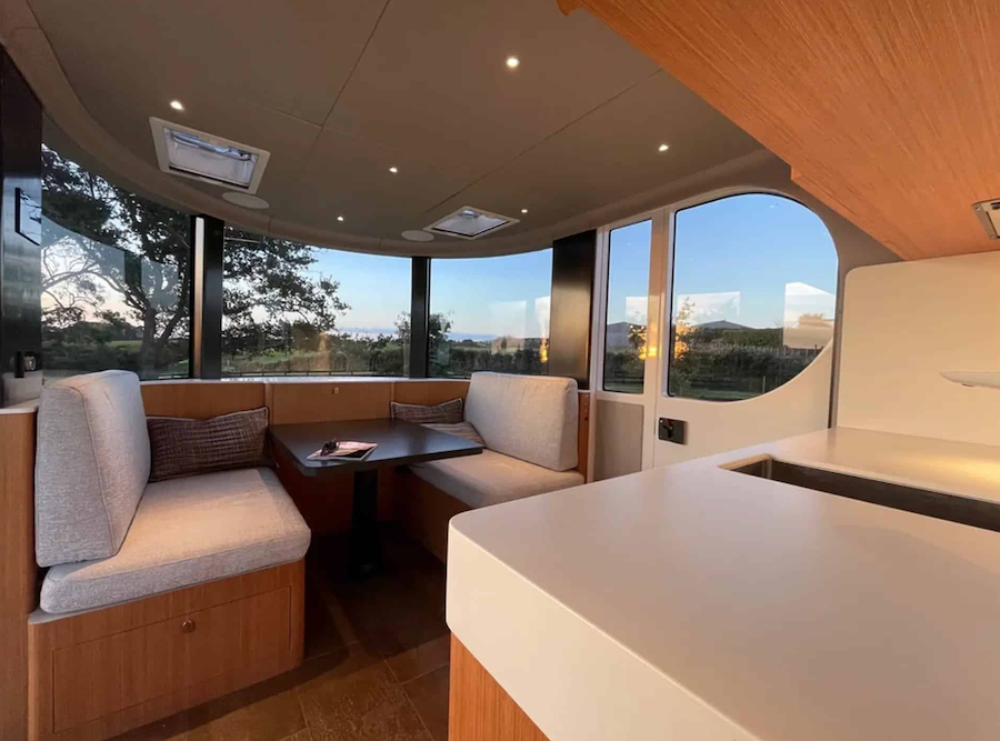 Romotow’un geniş alan vaadi yalnızca verandasıyla sınırlı değil. İç mekanın ön cephesi boyunca cam pencereler uzanıyor. Böylece yemek/oturma odası olan bu bölümde kullanıcı, iç mekanda olsa bile manzaraya hakim oluyor. Bu oturma alanları katlanarak yatağa dönüşebiliyor. Ayrıca arka taraftaki yatak odasında da çapları neredeyse yan cephe kadar olan 2 adet dairesel pencere bulunuyor.
