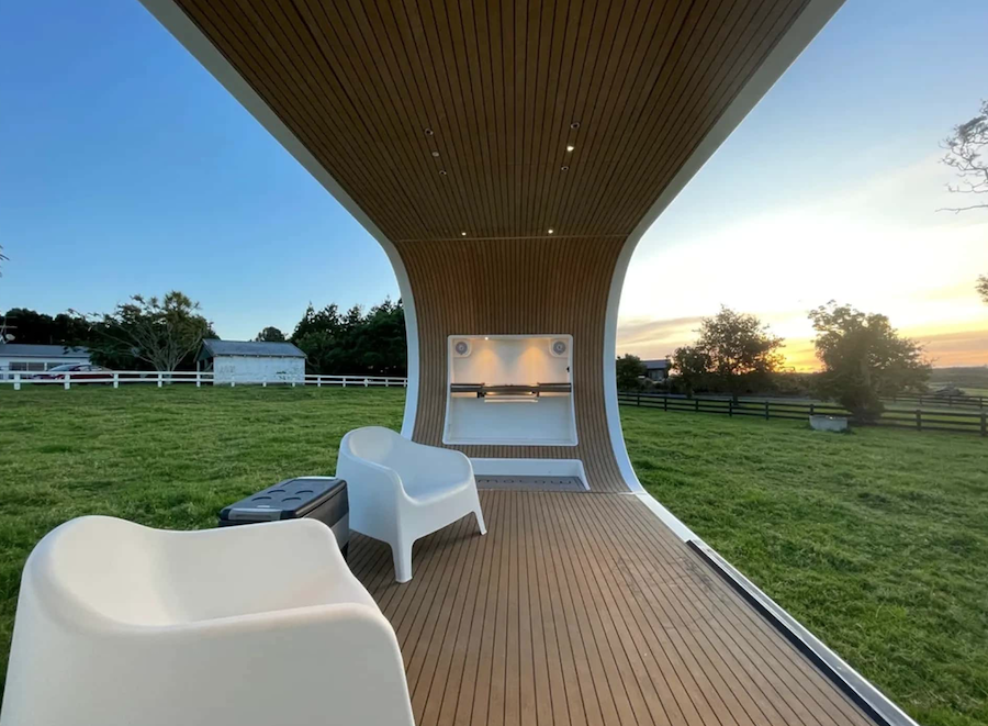 Açılır veranda, otomatik hidrolik sistemle mümkün olmuş. Sistem, römorkun çatısındaki güneş panellerinin yardımıyla şarj edilen bir lityum pille çalışıyor. Mekanizma, kabini 90 derece dışarı doğru iterek bir L şekli oluşturuyor. Böylece çok geniş bir veranda ortaya çıkıyor. Ek olarak, müşteri isterse verandaya böcekleri uzak tutmak için ağ yan duvarlar ve yerleşik katlanır mobilyalar eklenebiliyor.