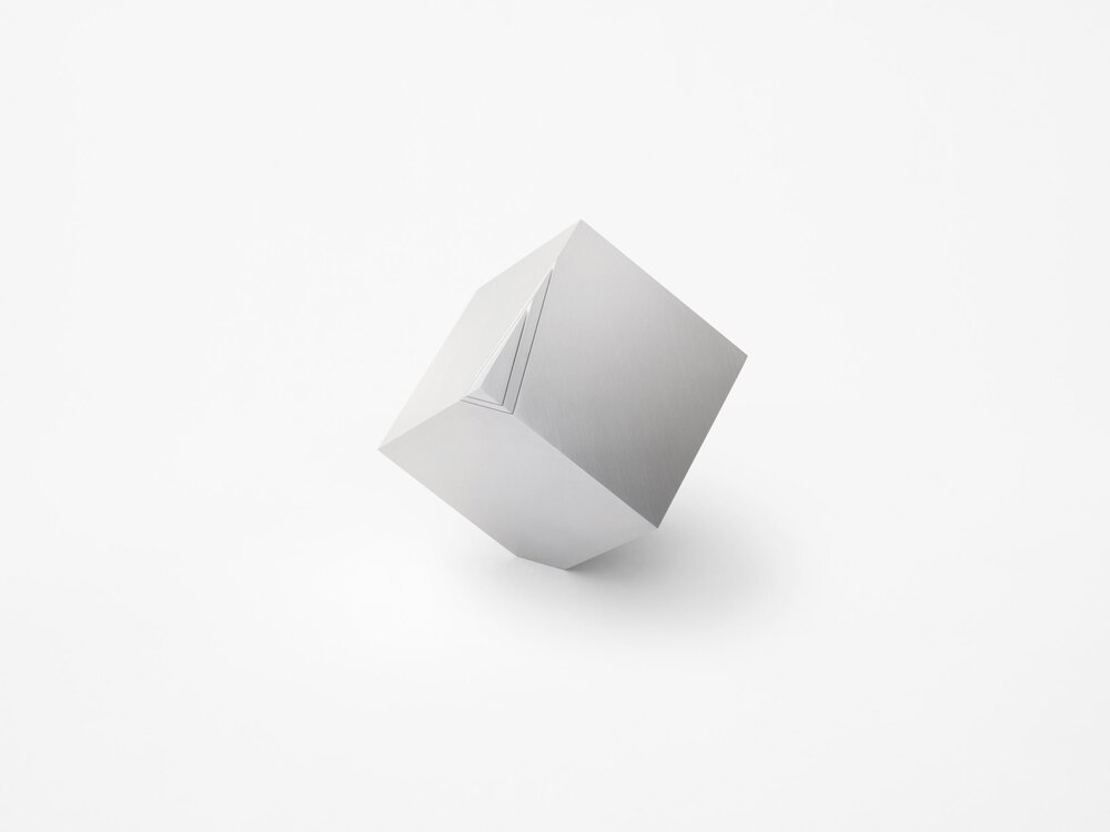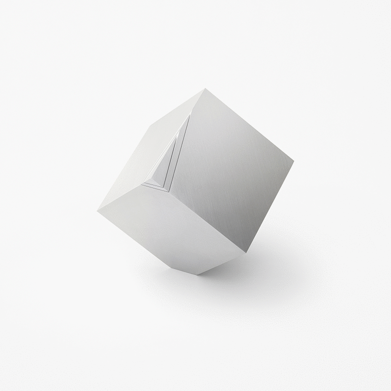 Cubic Clock, köşelerinden biri üzerine dengeli ve eğimli bir şekilde oturtulmuş. Tam karşıdaki köşesi ise bıçakla dilimlenmiş gibi görünüyor. Alüminyum küp gövdenin parçası olan bu dilimler, akrep ve yelkovan işlevi görüyor. Saate gereksiz parçalar ve malzemeler eklemek yerine stüdyo, köşelerden birini sökerek ve bu dilimleyerek istenen parçaları elde etmiş.