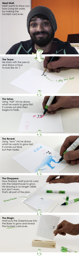 “Living Ink” adını verdikleri yosun bazlı mürekkeple dolu keçeli kalemlerle yaptığınız çizimler, kağıt üzerinde güneş gördükçe, birkaç gün içinde görünür olmaya başlıyor. Living Ink kalemler çok az miktarda siyanobakteri, su yosunu, klorofil içeriyor. Güneş ışınlarına maruz kalan su yosunu ve bakteriler çoğalıyor ve zamanla klorofil sayesinde yeşil renkte görünür olmaya başlıyorlar.