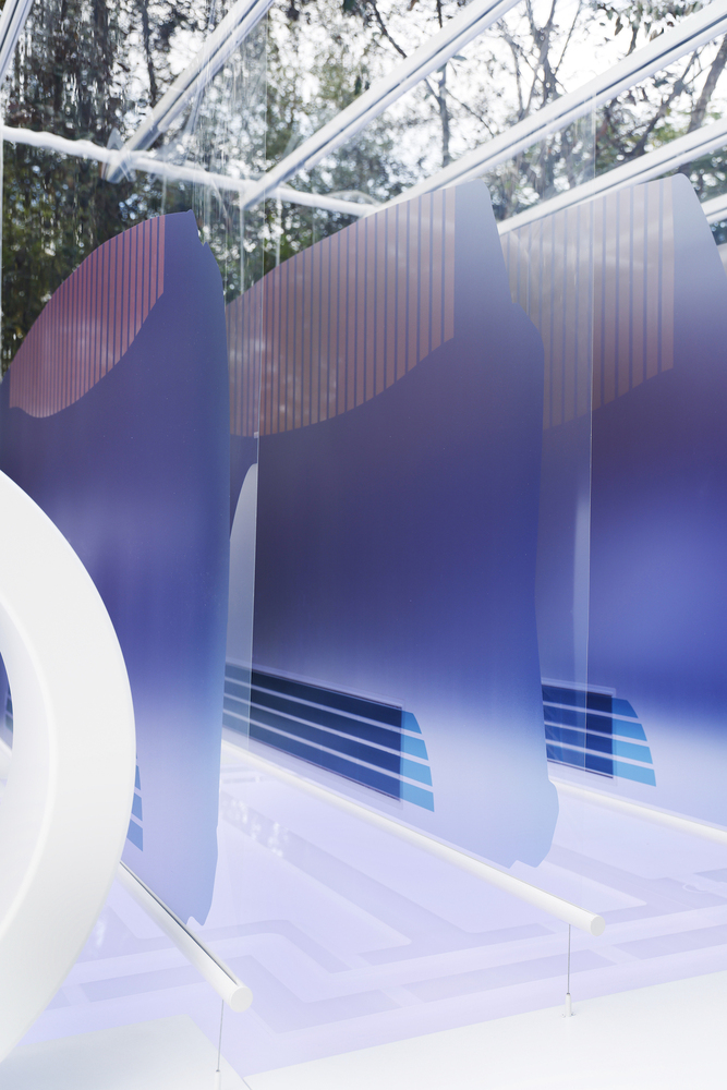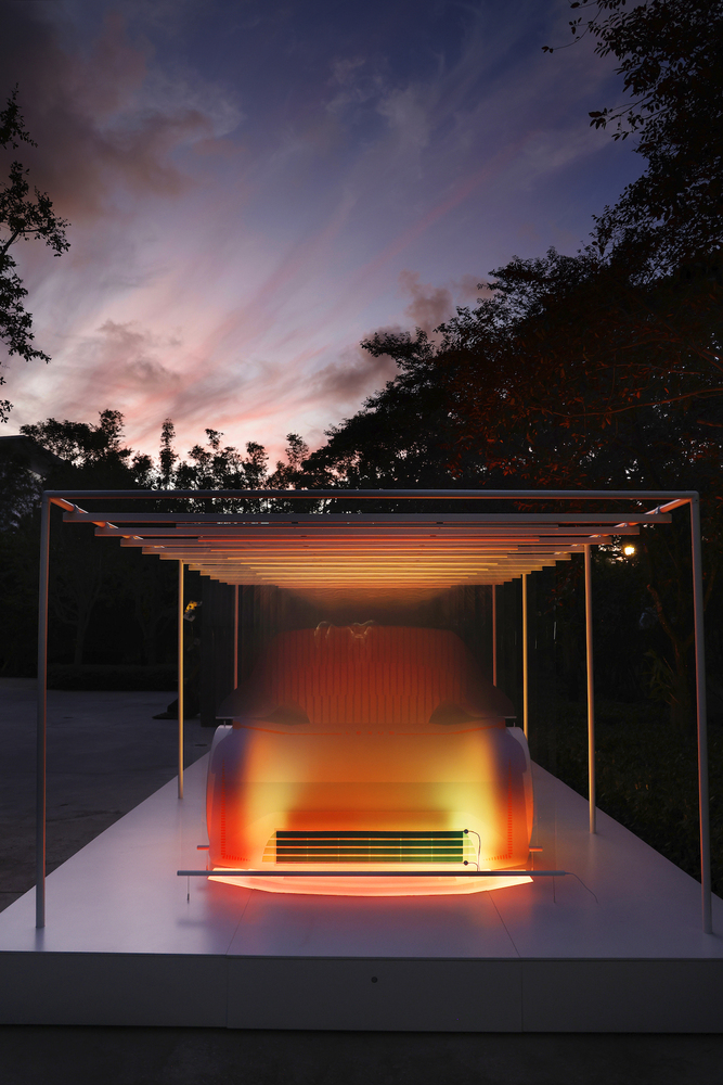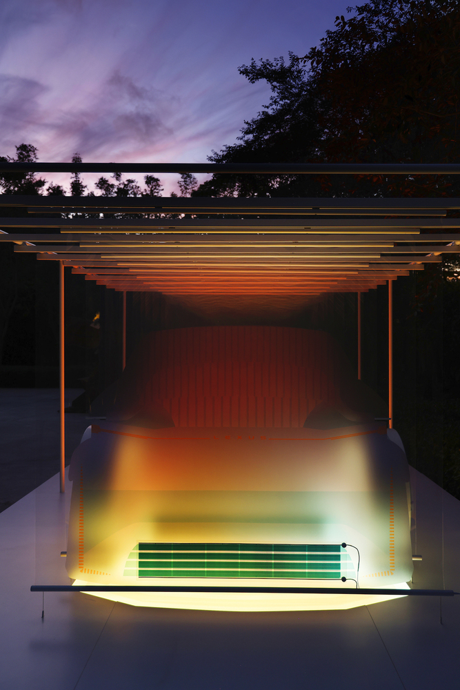 Yerleştirme, etrafta dolaşan izleyicilerin varlığına tepki veriyor. Dört hareket sensörü, otomobilin EV platformunu temsil eden kurulumun tabanı boyunca ışık saçıyor. Beklenmedik aralıklarla, geçici bir ışık değişimiyle canlanıyor. O anlarda ışık onun üzerinden akıyor. Bu da hareket halindeki arabanın dinamiklerini ve sürüş enerjisini yansıtıyor. Gün ilerledikçe OPV plakalarına yansıyan sıcak gün doğumu renklerinin yerini daha soğuk tonlar alıyor.