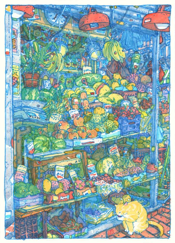 Rain Szeto; otomobil içinden kesitler, kalabalık kafeler, aile yemekleri ve sabah sakinliğini yaşayan dükkanlar çizerek yeni çalışmalarında da en zorlu kompozisyonları yüzeye aktarmayı başarmış. Sanatçının yerel mekan portreleri genellikle yalnız bir çalışanın, bir aile etkileşiminin ya da günlük gezintiler yapan bir kedinin hikâyesini aktarıyor. Ürün yığınlarını, mimari detayları, kedisel ve insani etkileri çekici tablolara dönüştürüyor.
