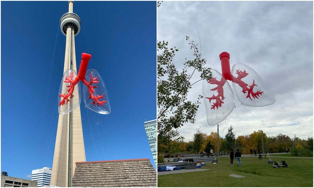 Not every day you see 32 foot tall transparent lungs floating above #Toronto. It’s #WorldLungDay. The travelling installation #LungsInTheAir is for the Canadian Lung Association. More than 15,000 #Canadians die each year due to air pollution-related causes. Next stop is Halifax. pic.twitter.com/OpvbUwBm9Z