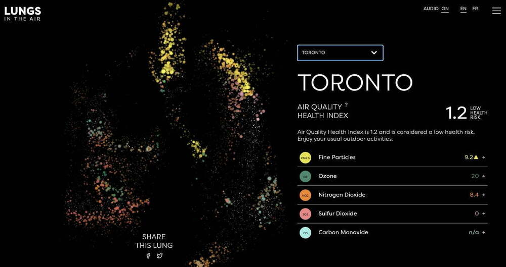 Kanada Akciğer Derneği (Canadian Lung Association) de Dünya Akciğer Günü kapsamında hazırladığı yerleştirme ile ülkede her yıl 15 binden fazla insanın kötü hava kalitesi nedeniyle öldüğünü hatırlatırken hava kirliliğinin akciğerler üzerindeki doğrudan etkisine göndermede bulunuyor.
