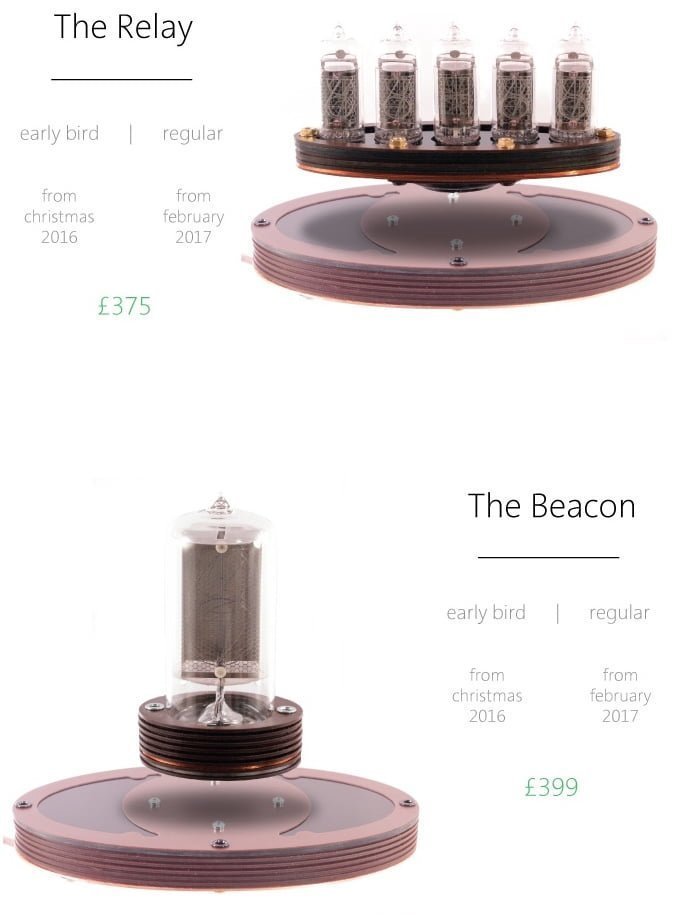 Nixie saatlerin yapımında 1950’lerde geliştirilen ve 90’lı yılların sonuna kadar kullanılan Nixie tüpleri kullanılmış. Nixie saatlerin yaratıcısı Tony Adams, geçmişe ait bu teknolojinin modern bir versiyonunu yaratabilmek için uzun araştırma ve geliştirme mesaileri harcamış. Sonuçta iki ayrı versiyonda Nixie saat tasarlamış: Ekranı 5 tüplü olan ilk versiyon The Relay ve ekranı tek tüplü olan versiyon The Beacon. The Relay, ay ve gün gösterebiliyorken The Beacon yalnızca saati gösterebiliyor. Beacon’ın bir farkı da Nixie tüpünün el yapımı olması. The Relay ise vintage Nixie tüpler temin edilerek yapılmış. Her ikisinin de alarmı var ve GPS alıcılarının saatiyle eşleşebiliyorlar. Beş tüplü olan modelde, tüplerin parlaklığı tek tek ayarlanabiliyor. Her iki versiyonda da solma/dalgalanma ve düz ekran modları bulunuyor. Tek tüplü modelde sayılar 50 mm yüksekliğinde ve yüzen nesne 130 mm yüksekliğinde. Beş tüplü modelde ise tüpler daha küçük olduğundan sayılar 18 mm yüksekliğinde ve yüzen nesnenin yüksekliği de 70 mm.