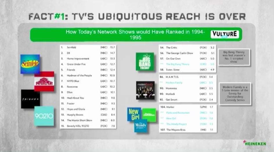 Markalar kurulur ve fikirleri olan yaratıcı insanlarla geliştirilir. Televizyon Heineken’in yıllarca önemli bir mecrası olmuştu. Televizyon sayesinde çok büyük kitlelere ulaştıklarını söyleyen Ron Amram, televizyonun ne yazık ki son 15 yılda gelişen teknolojilerle etkisini yitirdiğini söyledi. Televizyon izleyicisinin giderek azaldığını 1994-1995 ve şu anki televizyon reyting verileriyle gösteren Ron Amram, insanların içerik tüketmeye de giderek daha az zaman ayırdıklarını ve televizyonun çok uzun süreli bir mecra olduğunu söyledi.