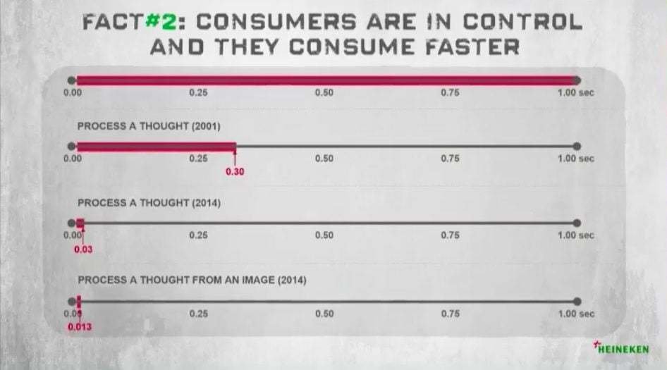 İnsanların günde sadece aşağı kaydırarak tükettikleri içeriklerin 100 metreye eş değer olduğunu söyleyen Ron Amram “bu da Empire State Binası ile aynı uzunlukta” dedi. Ayrıca içerik tüketmenin de süresinin değiştiğine değindi. İnsanlara ne kadar sürede düşünüp bir fikir bulabileceklerini sorsanız muhtemelen size 1 saniyede derler ama MIT’ye göre bu veriler yıllar içerisinde değişiyor, diye açıkladı. Şu anki içerik tüketme süremiz neredeyse verdiğimiz cevabın neredeyse 10 katı hızında.