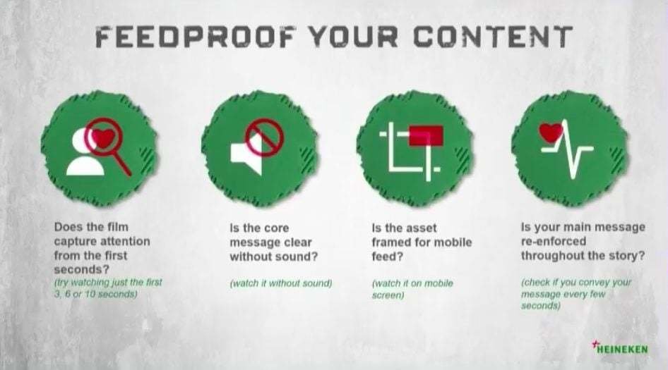 Ron Amram, internette tüketilen içeriklerin kısa sürede mesajını aşılamasının gerekliliğini Heineken reklamlarından örneklerle sunumunda anlattı. Facebook’ta çoğu videonun sesi kapalı halde tüketildiğini ve yatay reklamların doğru olmadığını belirtti. Televizyon için üretilen bir reklamın Facebook’ta sıkıcı sayıldığını açıkladı. Dört maddenin önemli olduğunun altını çizdi: Reklam ilk saniyede izleyiciyi yakalamalı, ses yokken de kendini izletebilmeli, mobil ekrana uyumlu bir ölçeğe sahip olmalı ve ana mesajını kısa sürede vermeli. Ayrıca Ron Amram, “Facebook Youtube’dan da kısa sürede tüketimin gerçekleştiği bir platform” dedi. Hangi platformu kampanyanızda kullanacaksanız öncelikle platformların tüketim şartlarını göz önüne almalısınız. Zekice hamleler tasarlamalı ve platformu yaratıcı bir şekilde kullanabilmelisiniz.