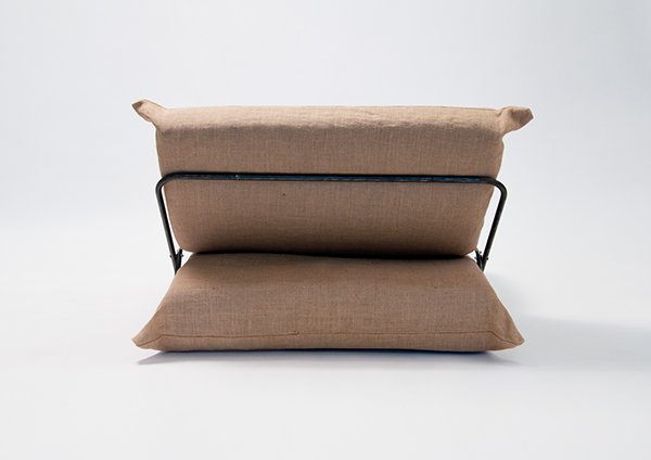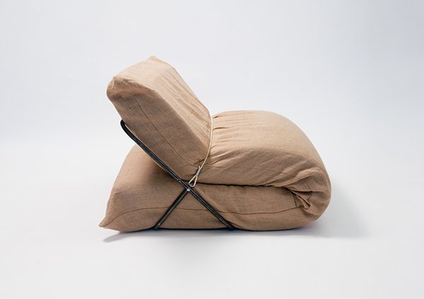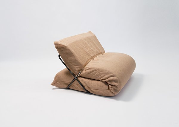 Tasarımda ve sanatta, yalın olanı yakalamak en zorudur. 2009’da Çin Sanat Akademisi’nden mezun olan ve bir süredir Fransa’da çalışmalarını sürdüren tasarımcı Biwei Pan da tasarımdaki mottosunu, Bruce Lee’nin “Zihnini boşalt, biçimsiz, şekilsiz – su gibi ol.” sözüyle özetliyor. Sho ile gerçekten bunu başardığını da görüyoruz.. Tasarım yalnızca metal bir iskeletten ve şilteden oluşuyor. Yerden yüksek bir koltuk istediğiniz zamanlarda şilteyi katlayıp metal iskelete yerleştiriyorsunuz. Ayaklarınızı uzatarak oturmak için de yalnızca şiltenin bir kenarını bükmeniz yeterli. Böylece şezlong benzeri bir koltuğunuz oluyor. Uyuyacağınız zaman da çerçeveyi kaldırıp şilteyi yere seriyorsunuz. Anlayacağınız üç işlevi bir arada sunan bir tasarım Sho. Metal iskeleti kullanmadığınız zamanlarda katlayıp kenara koyabiliyosunuz.