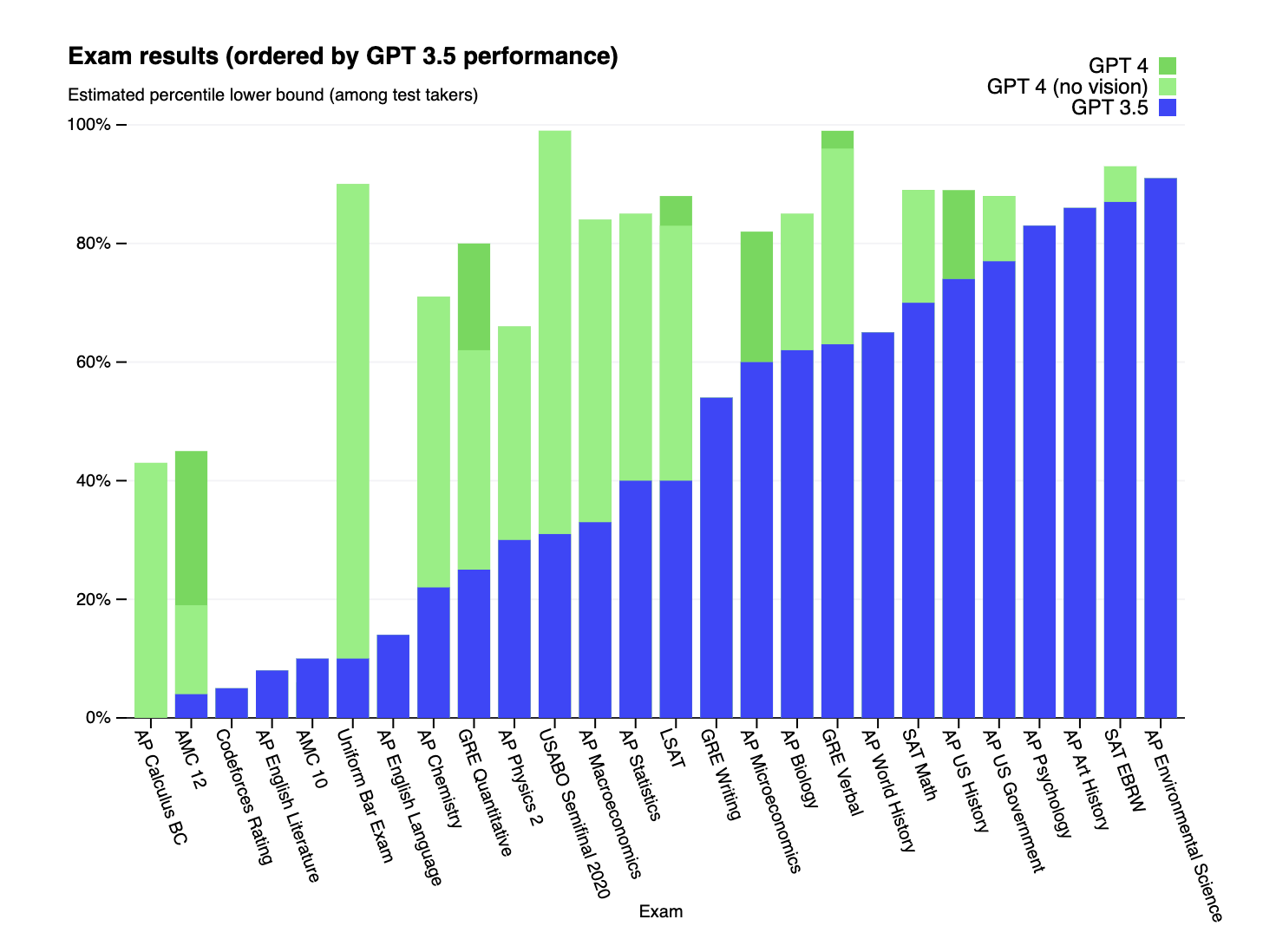60 sayfalık akademik bir makale ile GPT-4’e yönelik çalışmalarının teknik detaylarını yayınlayan Open AI ekibi, GPT-4’ün simüle edilmiş bir avukatlık sınavında yüzde 10’luk dilime girebildiğini, SAT okuma ve SAT matematik sınavında da benzer şekilde yüksek performans sergilediğini iddia ediyor. Yukarıdaki grafikte ChatGPT-4 ile önceki versiyonunun karşılaştırmalı sınav performanslarını inceleyebilirsiniz. Gelişmelerin yanı sıra yapay zekâ sohbet robotunun elbette halen bazı eksiklikler bulunuyor.