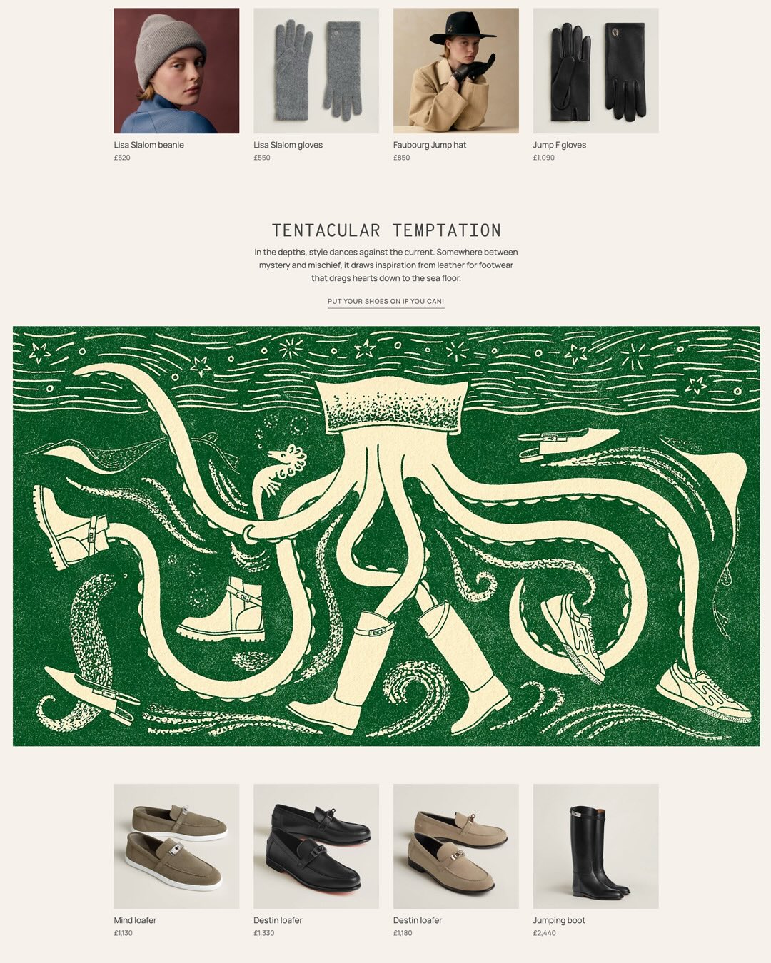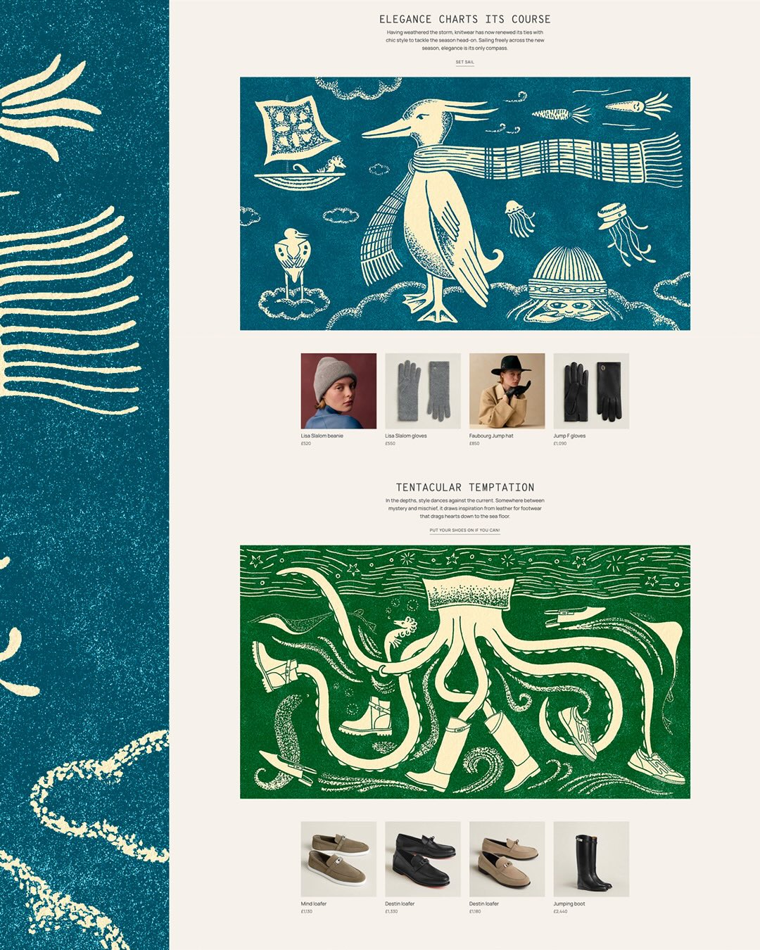 Tasarımlar, her biri sitenin farklı bir bölümünü temsil eden 12 ayrı illüstrasyondan oluşuyor. Bu illüstrasyonlar, 2–15 Ocak tarihleri arasında ana sayfada yer aldı. Tamamı elde çizilen çalışmalar, taş baskı tekniklerini çağrıştıran bir stile sahipken, ürünlerle eğlenceli ve zarif bir etkileşim halindeydi. Ortaya çıkan bu sanatsal katman, koleksiyon sayfalarını görsel olarak zenginleştirdi, kullanıcı deneyimini güçlendirdi ve Hermès’in estetik değerleriyle güçlü bir uyum sergiledi. İllüstrasyonlar, Hermès’in ikonik mirasını görünür kılarken, aynı zamanda tasarıma oyunbaz ve modern bir karakter kazandırdı. Ziyaretçiler koleksiyonları artık adeta lüks bir eskiz defterini karıştırıyormuş hissiyle keşfetti; bu yaklaşım markanın sanat anlayışının yalnızca ürünlerle sınırlı olmadığını açıkça ortaya koydu. Tasarım, aynı zamanda Kit Klein imzalı animasyonlarla markanın sosyal medya kanallarında da duyuruldu. Animasyonlardaki ses/müzik Pascal Armand tarafından yaratıldı.