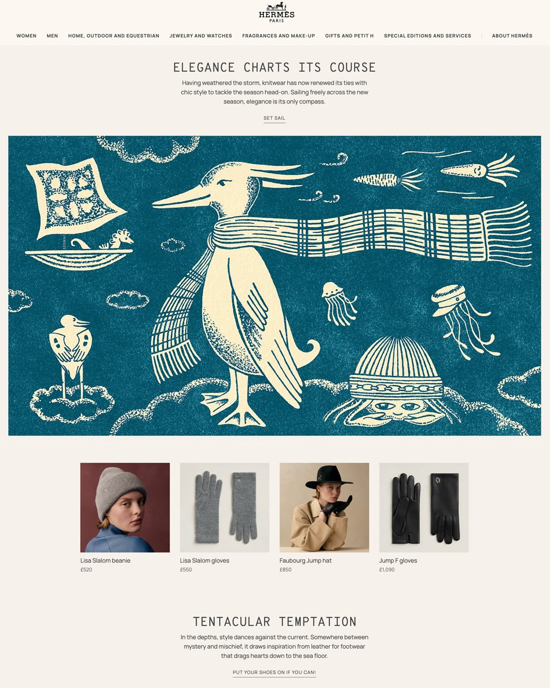 Fransız moda evi Hermès, tasarımcıların, kağıt sanatçılarının ve yerleştirme sanatçılarının imzasını taşıyan vitrin düzenlemeleriyle insan ürünü yaratıcı işlere verdiği önemi defalarca ortaya koydu. Yapay zekânın üretim süreçlerinde giderek daha fazla yer aldığı, buna tepki olarak da insan ürünü işlerin yeniden değer kazandığı bir dönemde, Hermès’in yaklaşımı değişmedi. 2025 yılı boyunca da uluslararası sanatçılarla iş birliği sonucunda doğan illüstrasyonlarla ve animasyonlu hikayelerle konuşuldu. Linda Merad‘ın illüstrasyonlarını merkeze alan geçici internet sitesi tasarımı da markanın her yaratıcı adımında olduğu gibi yine dikkat çekti. Tasarımlar, Hermès’in 2026 teması “Venture Beyond” (L’appel du large) kapsamında hazırlandı.