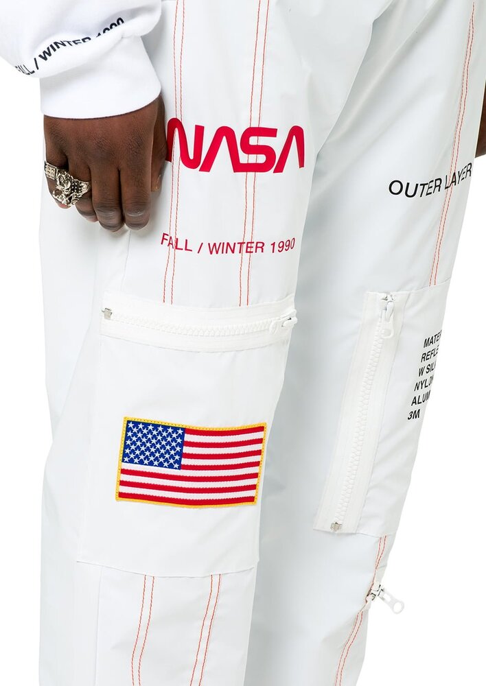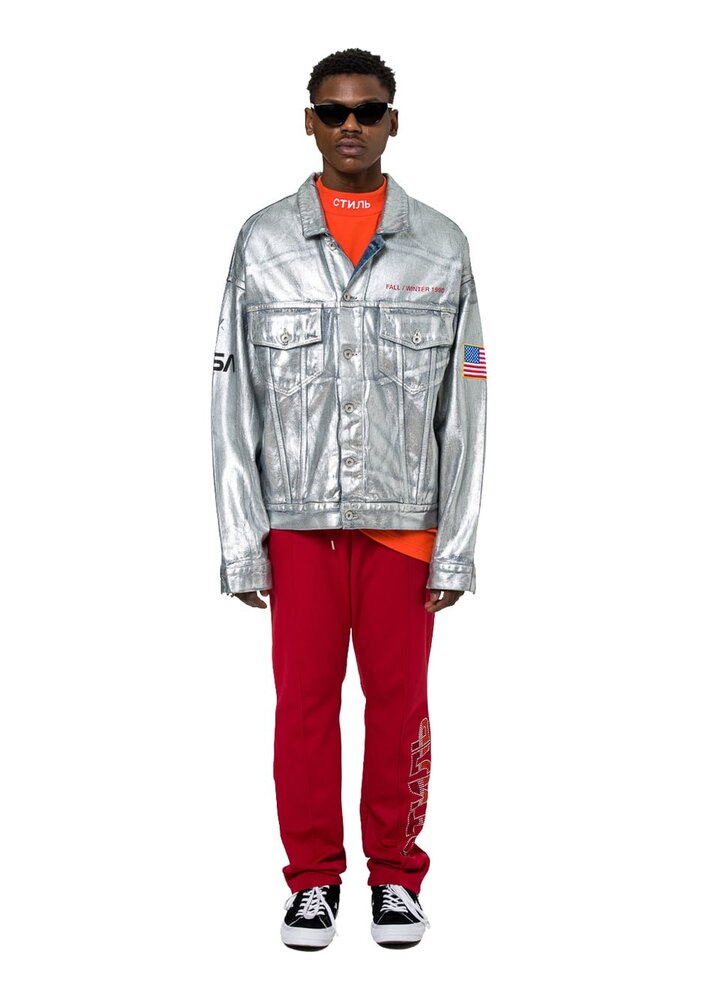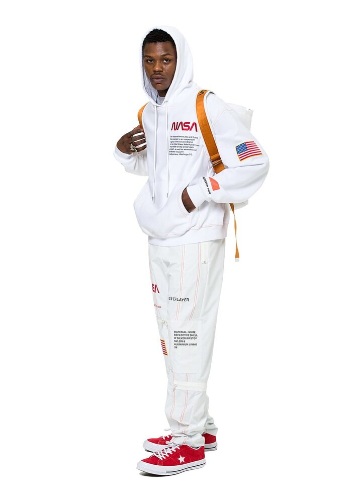 Ünlüler tarafından çok sevilen bir tasarımcı olan Heron Preston’un uzay temalı yeni koleksiyonunda 31 parça var. Koleksiyonda 3M naylon parkalar ve pantolonlar, metalik astronot montları, sweatshirtler, tişörtler, kepler, sırt çantaları ve çoraplar bulunuyor. Özellikle sırt çantası Paris’teki defilede büyük beğeni toplasa da modacının kişisel favorisi eşofman altı.