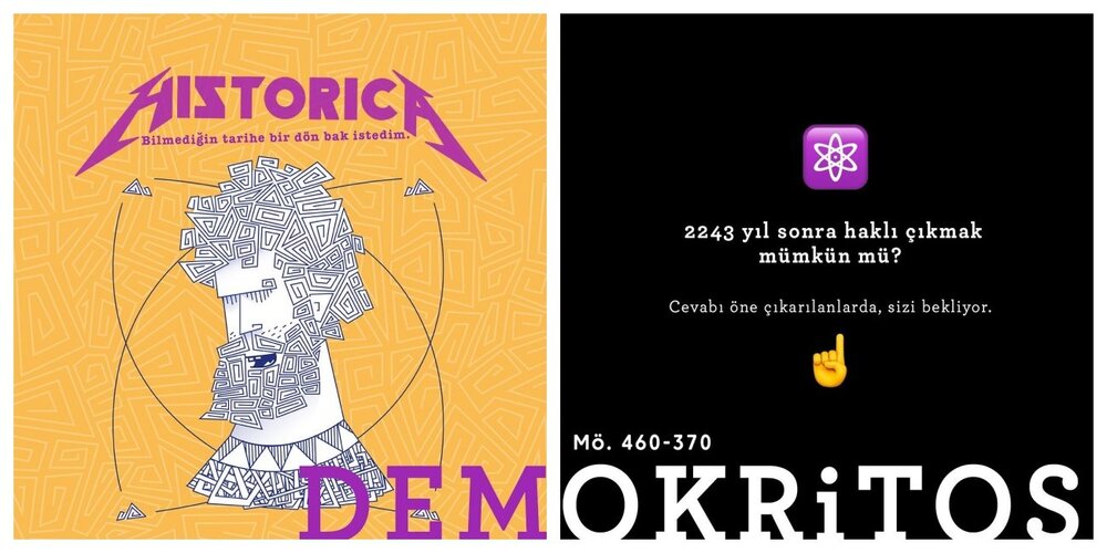 “Etkileşimli tarih ansiklopedisi” açıklamasının yer aldığı Historica Encyclopedias Instagram hesabı kolektif bir üretimin sonucunda ortaya çıkan işleri barındırıyor ancak hesabın arkasında daimi olarak çalışan iki kişi bulunuyor. Happy People Project ajansında yaratıcı yönetmenlik görevi üstlenen Serhan Acar ve Fikir Medya’da metin yazarlığı yapan, aynı zamanda hareket tasarımcısı (motion designer) olan Ozan Şenel.