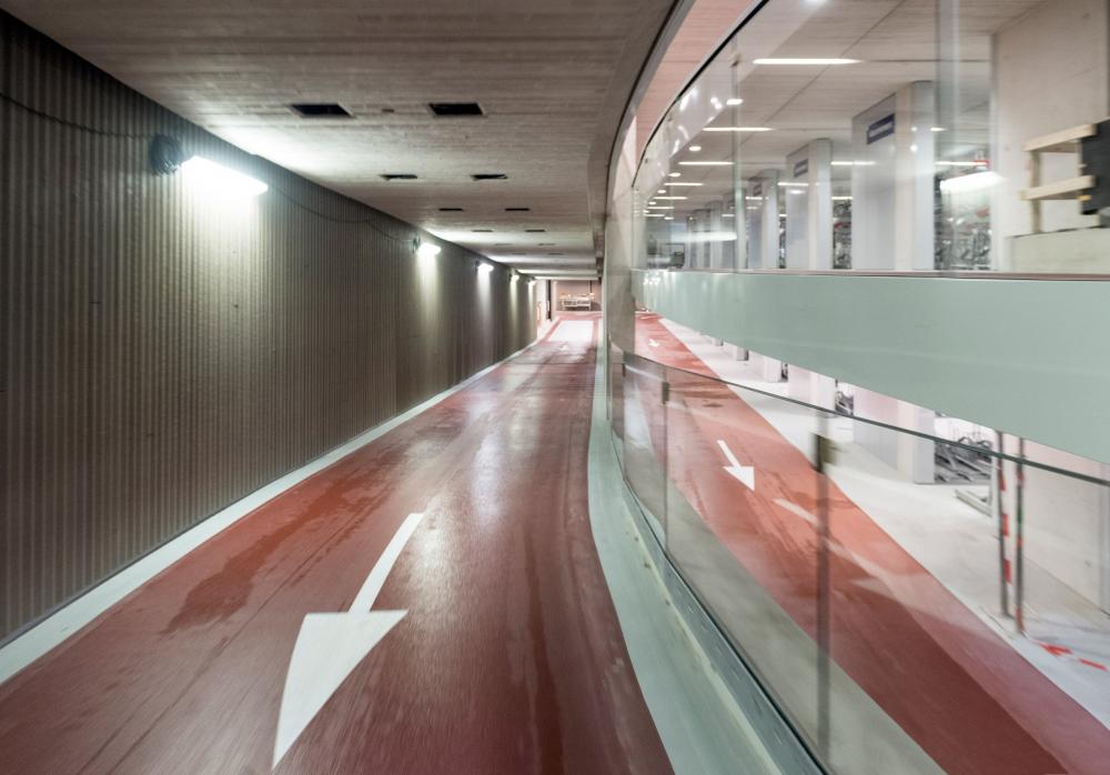 Kapalı alanda bisiklet sürülmesine izin verilen tek tesis olan yapı aynı zamanda personelli ve güvenlik amacıyla izleniyor. Bisikletçiler, merkezi park yerlerini çevreleyen tek yönlü bir rampa sistemiyle yeraltı alanına girip çıkıyorlar. Bisikletçiler dijital sistem rehberliğinde boş park yerlerine yönlendiriliyorlar ve toplu taşımada kullandıkları kartları kullanarak park ediyorlar. İlk 24 saat için ücretsiz olan otoparkta tamir, bisiklet parçası ve aksesuar sunan bir hizmet noktası da mevcut.