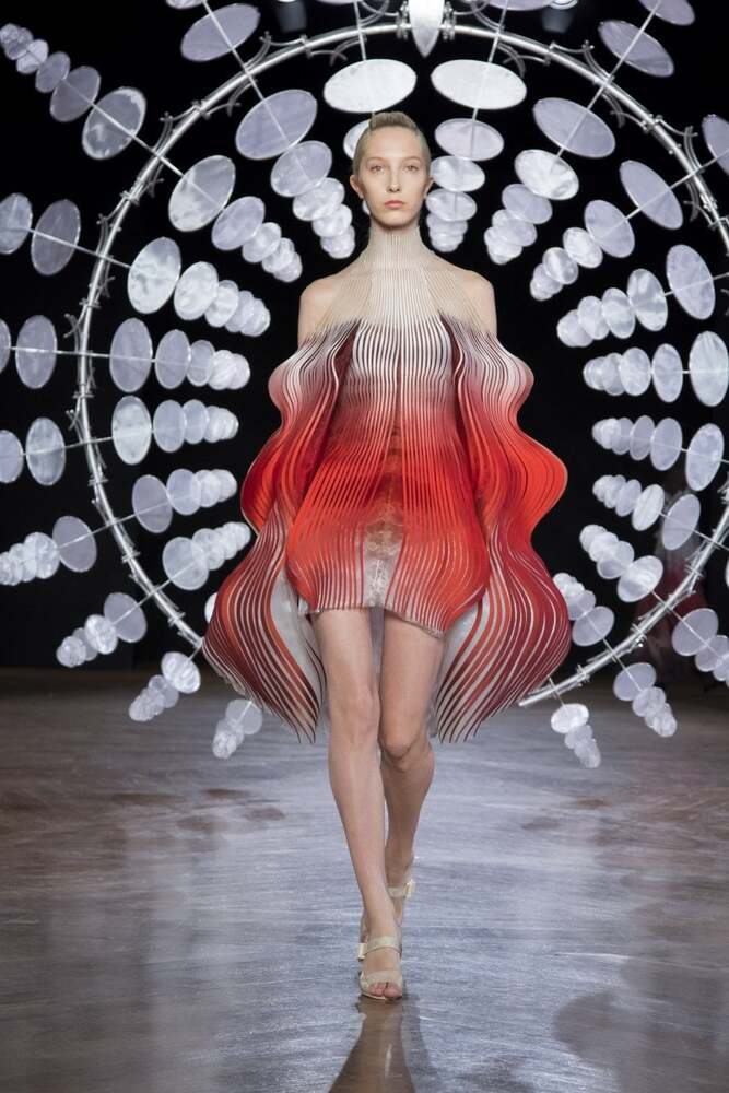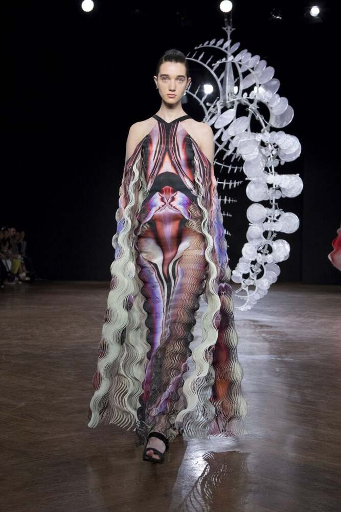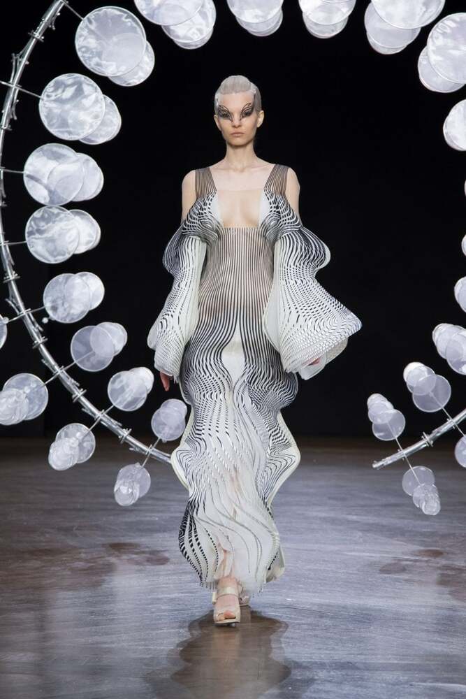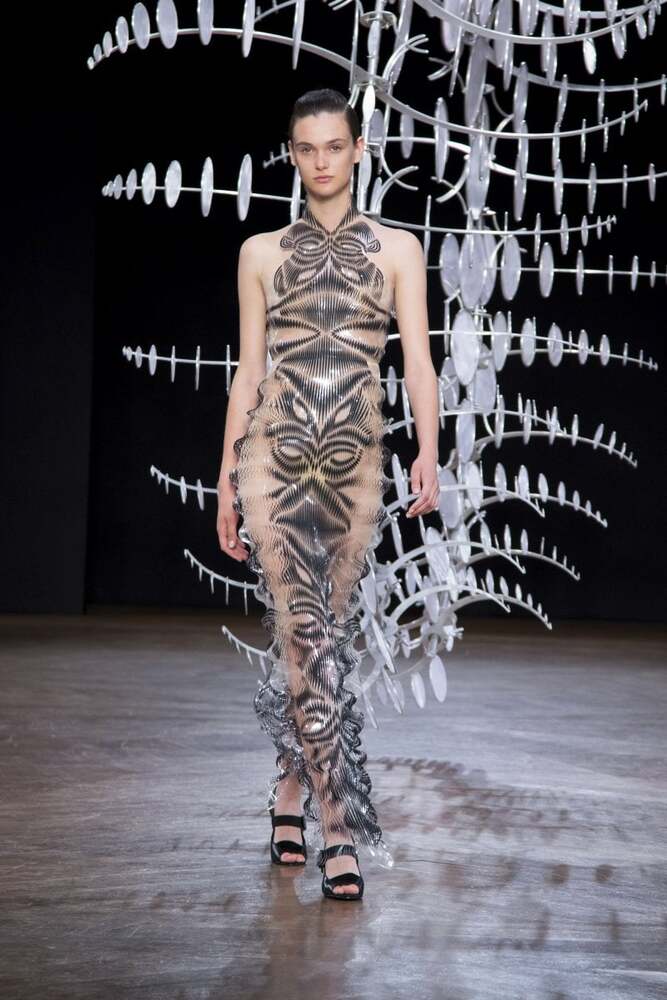 Hollandalı moda tasarımcısı Iris van Herpen’i; yıldızlar, Japon mitolojisi ve genetik mühendisliği ürünü hibrit bedenlerden ilham aldığı Shift Souls koleksiyonuyla tanımıştık. Kendisi teknolojiyi ve geleneksel couture işçiliğini birleştiren; geçmişin, şimdiki zamanın ve geleceğin estetik biçimlerini harmanlayan yenilikçi bir isim. Özellikle 3B baskının moda tasarımında kullanılmasında bir öncü. Tasarımcı, yeni koleksiyonu Hypnosis ile de ses getirmeye devam ediyor.
