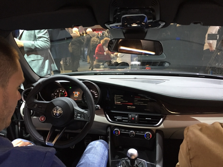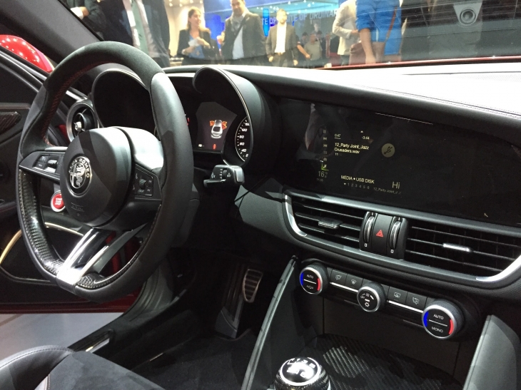 Giulia’nın içi de İtalyan yaratıcılığından nasibini almış. Araç içi ekranlarının konumlandırması konusunda sürekli şikayetlerin yaşandığı bugünlerde Alfa Romeo, Giulia’nın bilgi eğlence ekranını orta konsola kamufle olacak şekilde yedirerek gömmüş. Ekranın sınırları görünmüyor, böylece “buraya bir çerçeve çaktık içine de ekran koyduk” akımının dışına çıkmayı başarmış. Aracın iç tasarımında ekranın kendi başına öne çıkmaması ve içeriklerinin araçla bütünleşmesi iyi bir fikir. Giulia’nın ekranının parlaklığı biraz az gibi göründü bana ama bunu standart modeller geldiğinde daha iyi göreceğiz sanırım.
