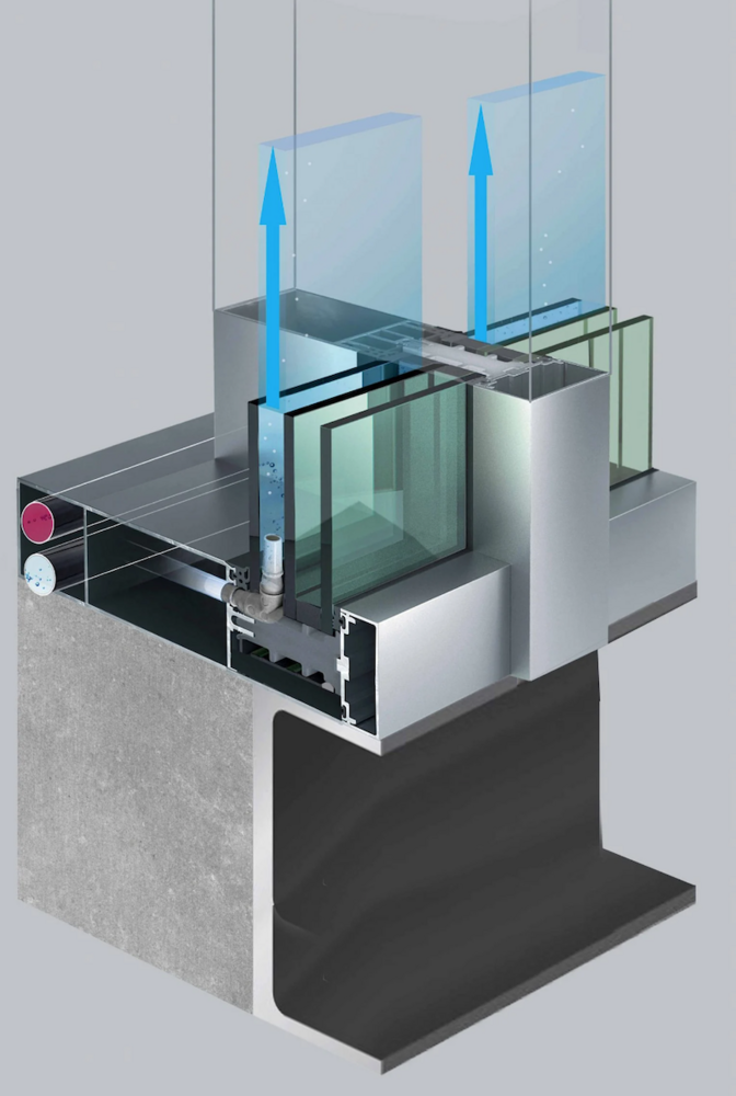 Pencerelerdeki camların içinde, aralarında güneş ışığını ve tüm diğer ısı kaynaklarını emen ince bir su tabakası yer alıyor. Su ısıya maruz kaldığında, bu ısı zemin altındaki kapalı borulardan düşük basınçla binanın daha soğuk bölgelerine veya bir termal depoya pompalanıyor.