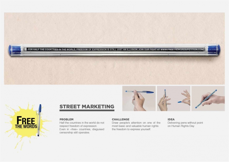 İnsan Hakları Günü’nde bir tükenmez kalem olarak dağıtılan kalemleri açan kullanıcılar kalemin her iki tarafının da kapalı olduğunu görüyorlar. Durumu anlamak isterken kaleme incelemeye başlayınca ise kalemin üzerinde şu yazıyla karşılaşıyorlar. “Dünyadaki ülkelerin yarısı için ifade özgürlüğü hala sadece bir illüzyon”