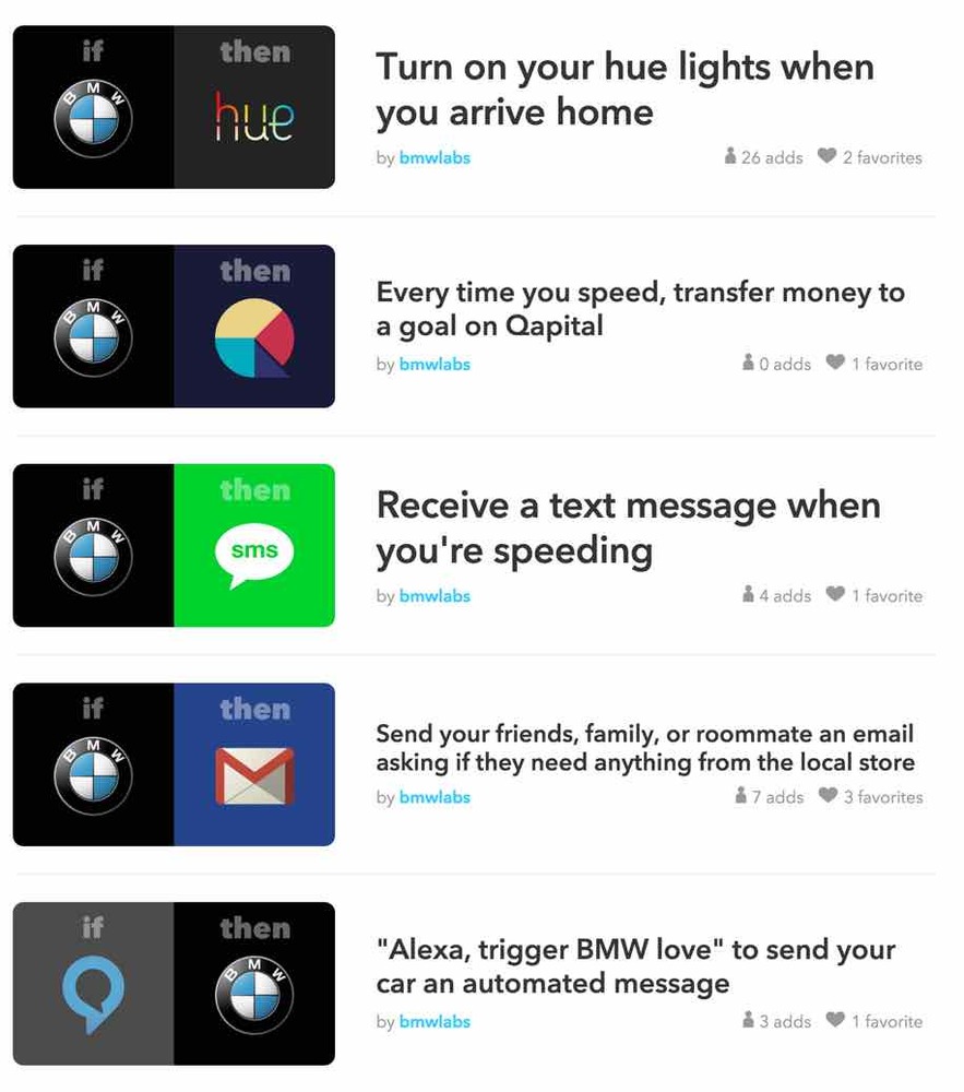 IFTTT‘nin bu geniş havuzuna, bu hafta içi BMW de katıldı. BMW Labs‘ın inisiyatifiyle yapılan entegrasyon sonucunda 270’den fazla IFTTT kanalına dolaşarak otomobilimizin de içinde olduğu reçeteler yazabileceğiz. Bu alana giriş yapan ilk otomotiv markası olan BMW ve IFTTT ile yapabileceklerimize birkaç örnek ise BMW Labs’ın sayfasında listeleniyor.