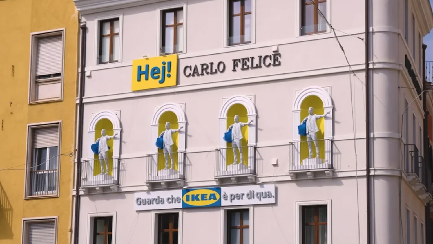 Ogilvy İtalya iş birliğiyle hazırlanan kampanya için Yenne Meydanı’na, tam Kral Carlo Felice heykelinin karşısına bir dizi heykel yerleştirildi. Her figür, Kral Carlo Felice’in kol pozunu taklit ediyor ama farklı bir yönü işaret ediyor. Ortaya çıkan kompozisyon, ziyaretçilere IKEA’nın yeni mağazasına giden yönü gösteriyor. Yerleştirilen metinde de Kral Carlo Felice’e sesleniliyor ve bu yönün IKEA’ya gittiği belirtiliyor.