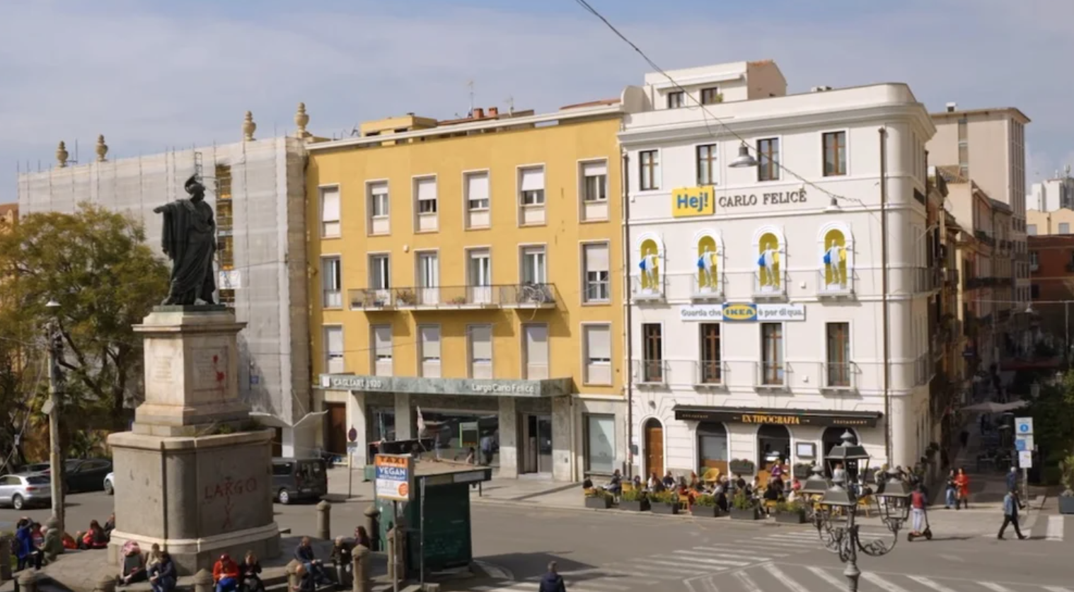 Heykel, 19. yüzyılda yaşamış Kral Carlo Felice’i temsil ediyor ve yıllardır “Kraliyet Yolu”nu göstermek yerine başka bir istikamete işaret ediyor. Bu durum, Cagliari halkı arasında bilinen bir şey. IKEA ise heykelin etrafından dolanarak yaratıcı bir çözüm geliştirdi.
