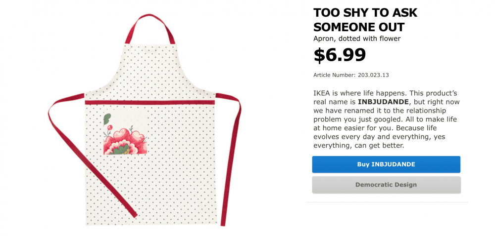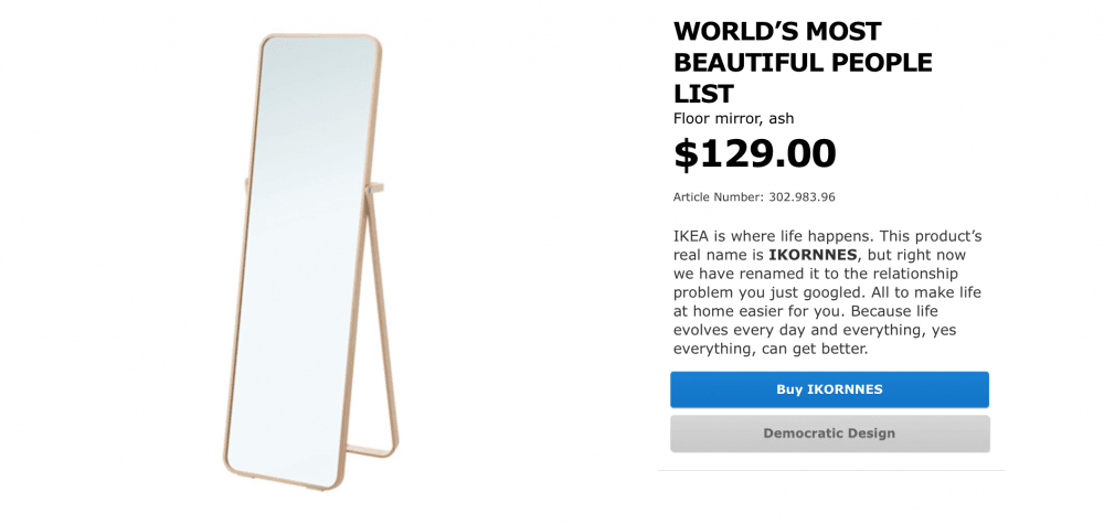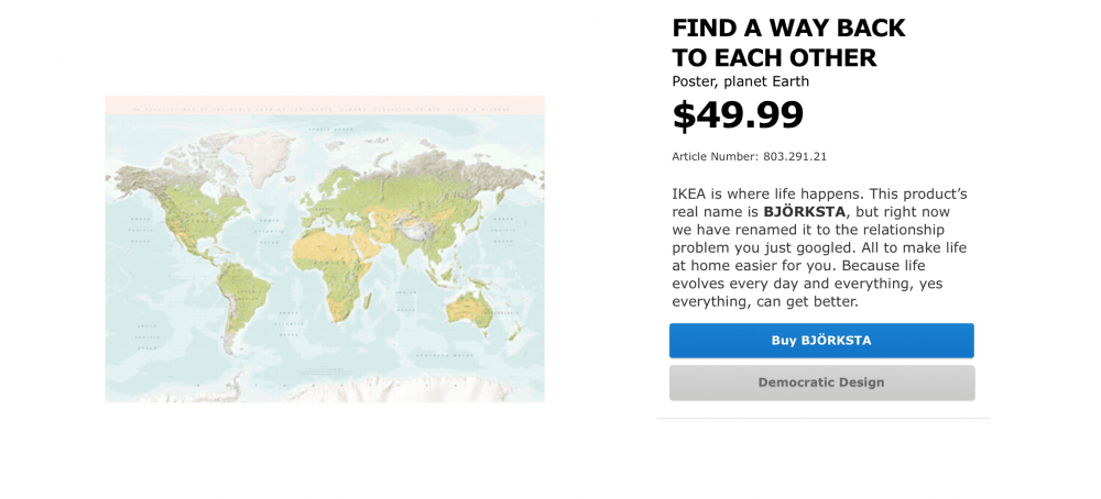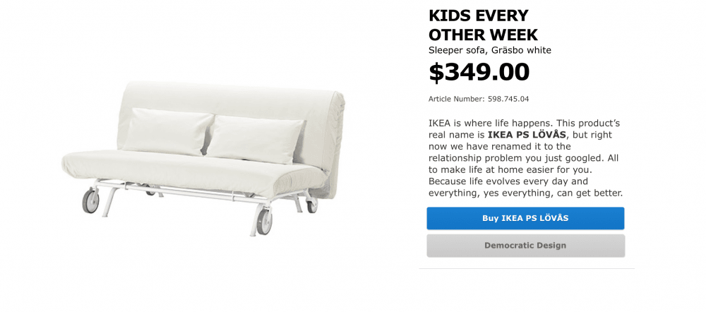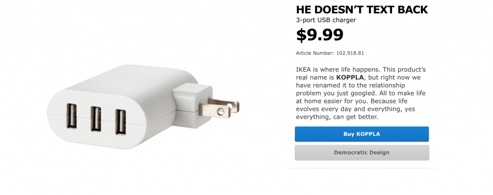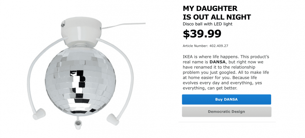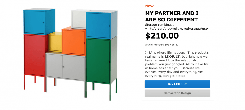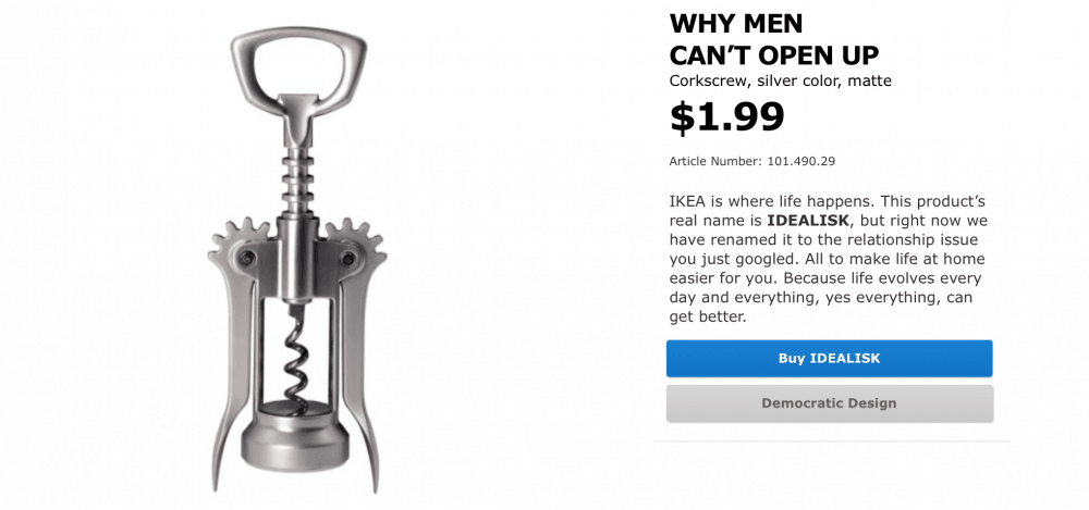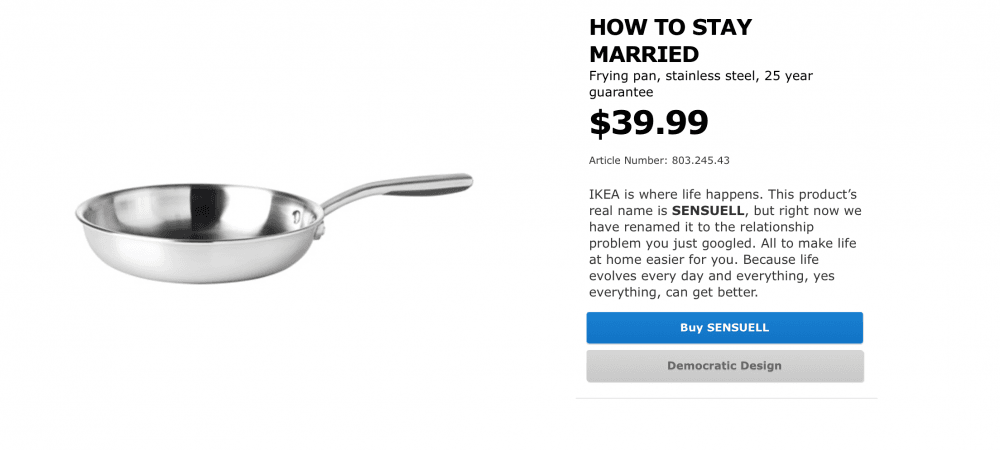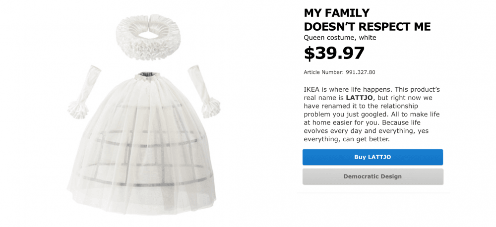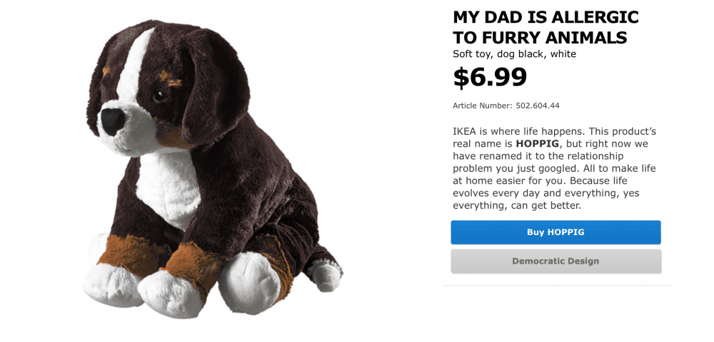 Ürünler bazen sorunun doğrudan çözümünü, bazen de soruna farklı ve mizahi bir yaklaşım sunabiliyor. Örneğin, “Babamın hayvan alerjisi var” yazdığınızda karşınıza tüylü bir köpek çıkarken, “Ergen oğlumla başa çıkamıyorum” sorununa çözüm bir valiz olabiliyor. “Abimle bağımız yok” konusuna IKEA çözümü bağlantı kablosu. IKEA; kavga eden kardeşlere masa separatörü, kız arkadaşını geri isteyene hediye paketi süsü, yerinde oturamayana sallanan sandalye, çocuklarına söz geçiremeyene tef, bir erkeği reddetmek isteyene sarımsak ezici gibi çözümler -pardon, ürünler- sunuyor.