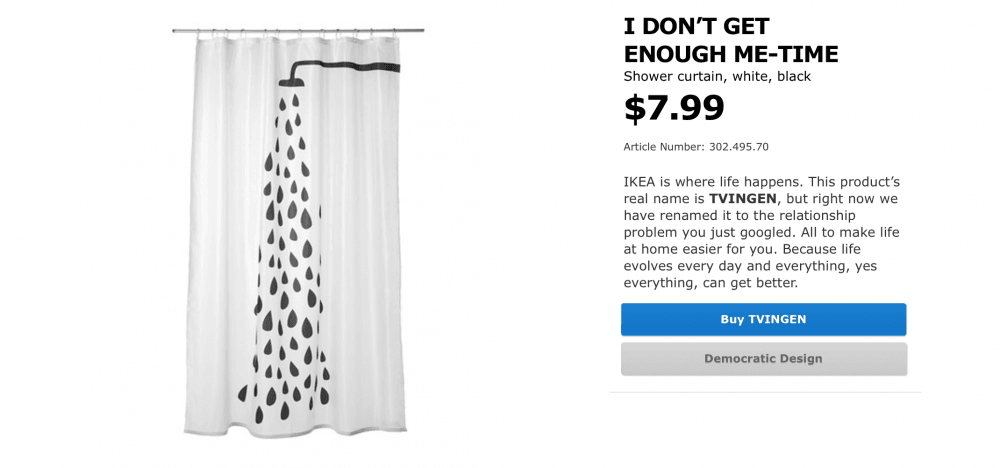 Alışveriş terapisi olarak çevirebileceğimiz bu kampanyada, İsveç Google’ına en çok sorulan sorular ve sorunlar bulunmuş. Bu sorular, SEO yardımıyla IKEA ürünleriyle eşleştirilmiş, hatta o ürüne o sorunun adı verilmiş. Google’da sorununuzu yazdığınızda IKEA’nın ilgili ürünün reklamıyla karşılaşıyorsunuz. Yönlendirildiğiniz Retail Therapy sitesinde de ürünler yeni isimleriyle yer alıyor.