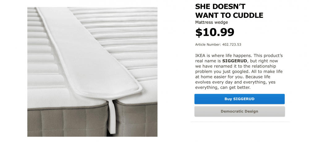 Ürünler bazen sorunun doğrudan çözümünü, bazen de soruna farklı ve mizahi bir yaklaşım sunabiliyor. Örneğin, “Babamın hayvan alerjisi var” yazdığınızda karşınıza tüylü bir köpek çıkarken, “Ergen oğlumla başa çıkamıyorum” sorununa çözüm bir valiz olabiliyor. “Abimle bağımız yok” konusuna IKEA çözümü bağlantı kablosu. IKEA; kavga eden kardeşlere masa separatörü, kız arkadaşını geri isteyene hediye paketi süsü, yerinde oturamayana sallanan sandalye, çocuklarına söz geçiremeyene tef, bir erkeği reddetmek isteyene sarımsak ezici gibi çözümler -pardon, ürünler- sunuyor.