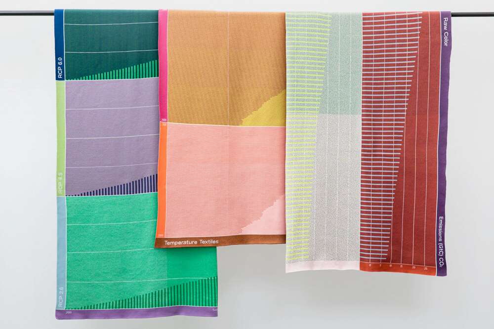 İkili her tasarımda IPCC’den (Intergovernmental Panel on Climate Change/ Hükümetlerarası İklim Değişikliği Paneli) gelen verileri 2100 yılına kadar dünya için dört olası sonucu temsil eden renkli, çizgi grafiklere dönüştürüyor. Temperature Textiles koleksiyonunda sıcak tonlar ağırlıkta. Mavi, mor ve yeşiller ise deniz seviyesini temsil ediyor. Değişimleri görselleştirmek için bu sıcak ve soğuk tonların kombinasyonları kullanılmış.