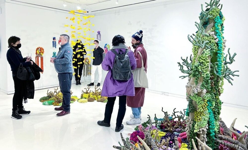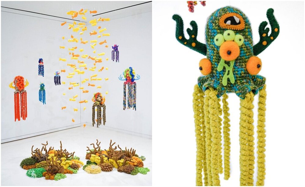 Mulyana, su altındaki yaşamı temsil eden etkileyici örgü ve tığ işleriyle biliniyor. Sanatçının daha önceden ahtapotlar başta olmak üzere okyanus canlılarını konu edindiği eserlerini sizlerle paylaşmıştık. Mulyana’nın kişisel sergisi Fragile Ecologies de yine okyanusun derinliklerin ilham alan yaratımlar içeriyor.