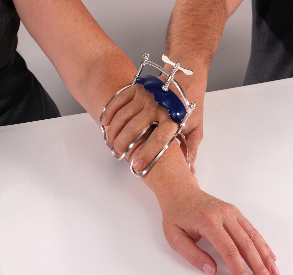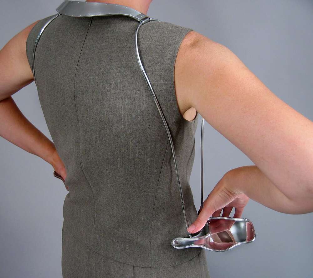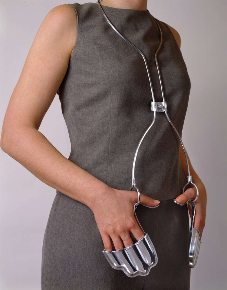 Jennifer Crupi, uzuvları ve gövdeleri çerçeveleyen metal mekanizmalar tasarlarken “vücutlarımız nasıl iletişim kurar?” sorusunun yanıtını arıyor. Sanatçı jestleri süsleme olarak kabul ettiği sıra dışı koleksiyonlarıyla tanınıyor. Yeni Tools for Reassuring Contact (Güven Veren Temas Araçları) serisi de öncekilere benzer şekilde ellere odaklanıyor ve insan dokunuşunun gücünü vurguluyor.