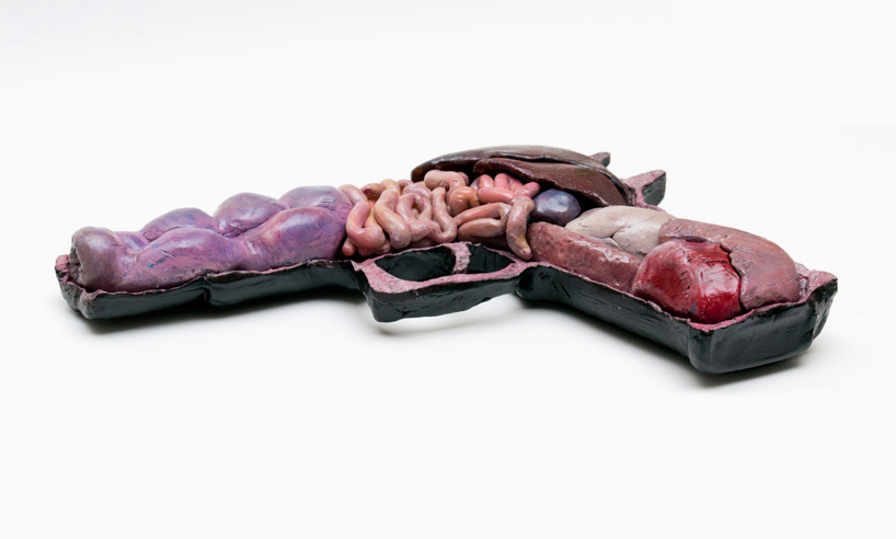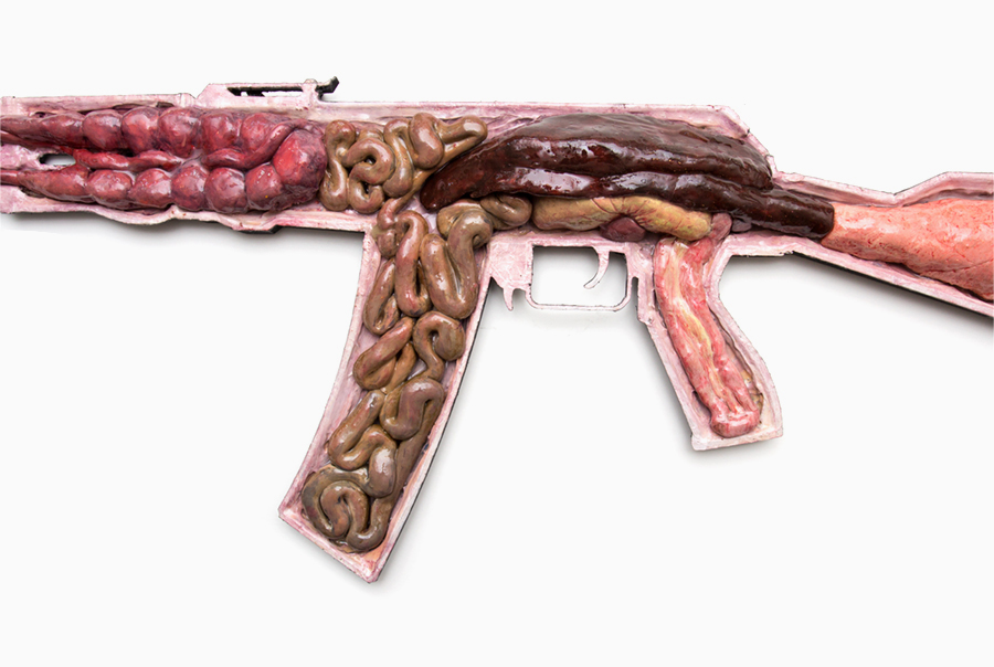 Noah Scalin‘in, “Savaşın Anatomisi” adını verdiği heykel serisi, otopsi yapılan ve içinden insan iç organları çıkan AK-47 ve tabancalar içeriyor. Sanatçının polimer kil, akrilik ve emaye kullanarak hazırladığı, ortadan ikiye bölünmüş boy boy silahın içine yerleştirdiği barsak, ciğer gibi iç organların görünümü de oldukça gerçekçi, hatta mide bulandırıcı. Her silahın, sahibinin parçasına dönüşmesini Scalin insan iç organlarını silahların içine doldurarak göstermiş.