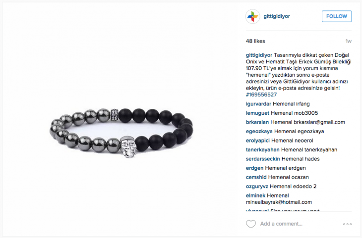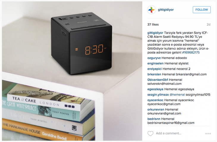 Sistem şöyle işliyor: Gittigidiyor Instagram hesabında görüp beğendiğiniz ürünün altındaki yorum kısmına “hemen al” yorumuyla birlikte, kullanıcı adı ve e-posta bilgilerinizi yazıyorsunuz.