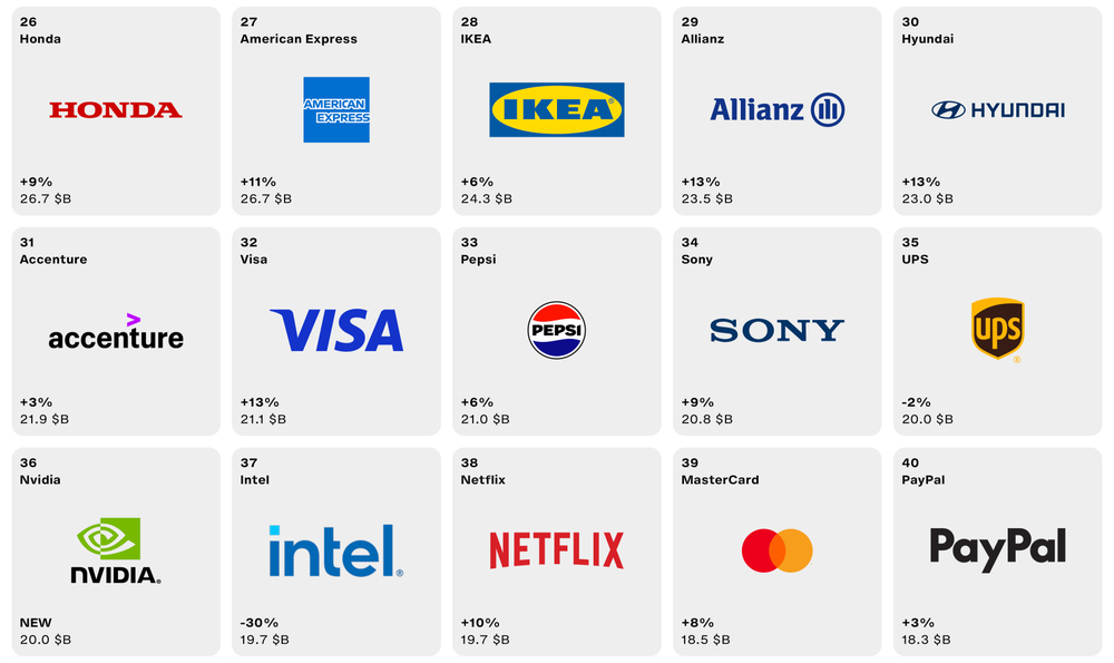 Nike 14. sırada yer alırken Jordan da 99. sıradan bu seneye listeye giriş yapmış. Instagram (15.) ise Facebook’tan (21.) yukarıda yer alıyor. Nvidia ve Intel sıralamada 36 ve 37. olarak arka arkaya geldiğini görüyoruz.