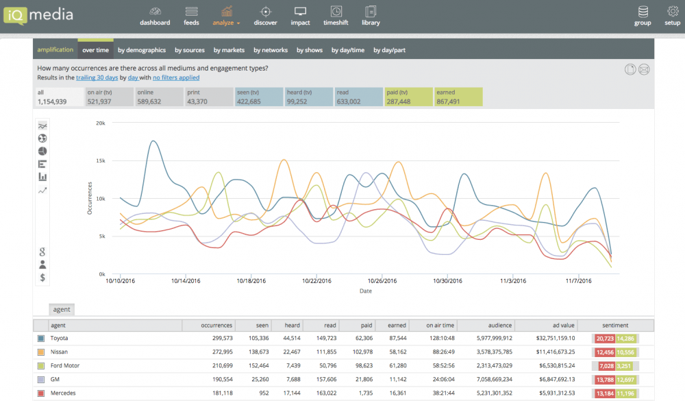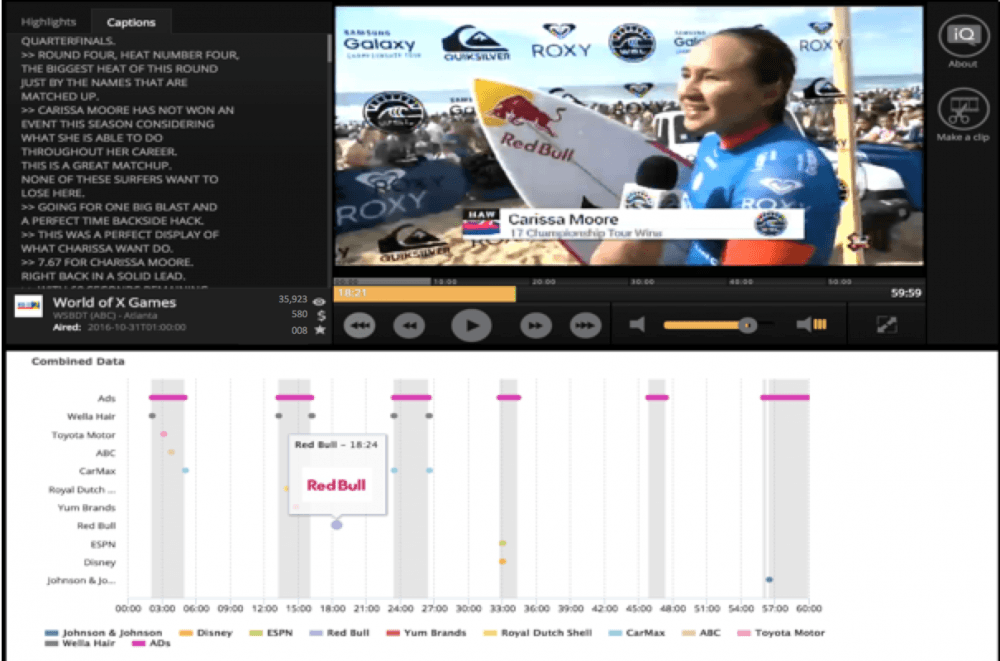 Philadelphia merkezli bir medya ölçümleme şirketi olan IQ Media, bu konuya el atmış ve markalara kendi markalarının veya rakiplerinin TV’deki her görüntülenme veya bahsedilme anını arama imkanı veren bir sistem sunuyor. Konuşulanları algılama özelliği içeren platformda aynı zamanda logo tanıma özelliği de var. 30 fps ile çalışan sistem logoyu bir şapka ya da tişört üzerinde bile olsa yakalayabiliyor.