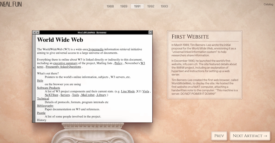 Neal Agarwal, Google Street View’da saklı tuhaflıklar evreninde gezinmeyi sağlayan Wonders of Street View ve şifre oyunu The Password Game gibi ilginç projeleriyle radarımıza takılmıştı. Projelerini neal.fun çatısı altında sıralayan yazılımcı, bu defa da internetin erken dönemlerine dair mihenk taşlarını Internet Artifacts isimli bir çevrim içi müzede topladı.