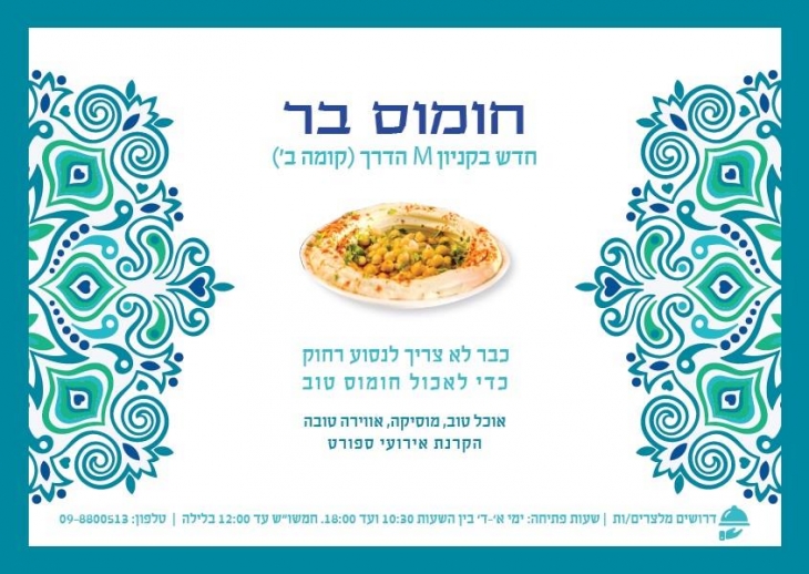 “Araplardan korkuyor musun? Musevilerden korkuyor musun? Bizde Arap yok! Musevi de… Bizde sadece insan var! Ve gerçek, harika Arap humusu! Ve muhteşem Musevi falafeli! Arap, Musevi, Hristiyan, Hintli, kim olursanız olun humus tabağınızı ücretsiz olarak tekrar doldurabilirsiniz… Özel indirim: Arap ve Musevilerin birlikte oturduğu masalara humus yemeklerinde %50 indirim!”