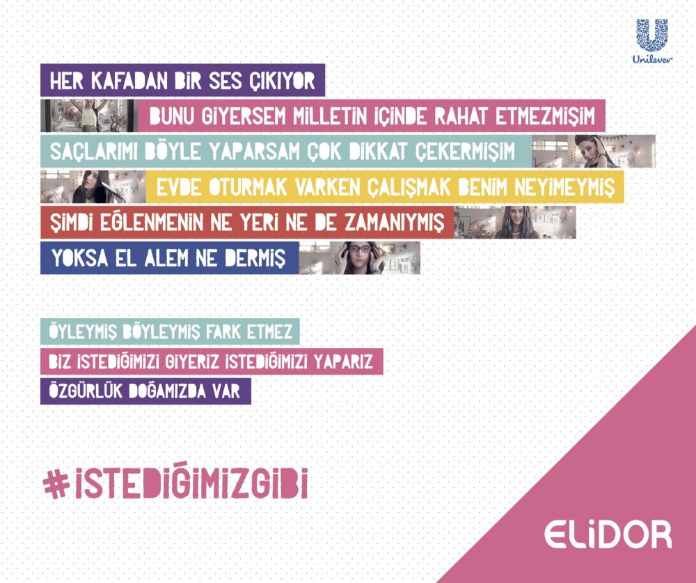 Manajans JWT tarafından hazırlanan kampanya “Özgürlük Doğamızda Var” mesajı ile kıyafet ve daha pek çok alandaki kadın özgürlüğüne Elidor’dan bir destek. Sosyal medyada #istediğimizgibi etiketiyle yer alan kampanya; kadınların saçından kıyafetine her şeyine karışılmasının eleştirildiği bir filmle başladı. Genç kadınların seçtikleri yaşam stili ne olursa olsun hayatın her noktasında istedikleri doğrultuda hareket etmeleri gerektiğinin altını çizen film; Instagram ve Twitter üzerinden girilen postlar ve Stories / Moments kullanımlarıyla da desteklendi. Kampanyaya ilgi büyük oldu ve etiket altında pek çok mesaj birikti.