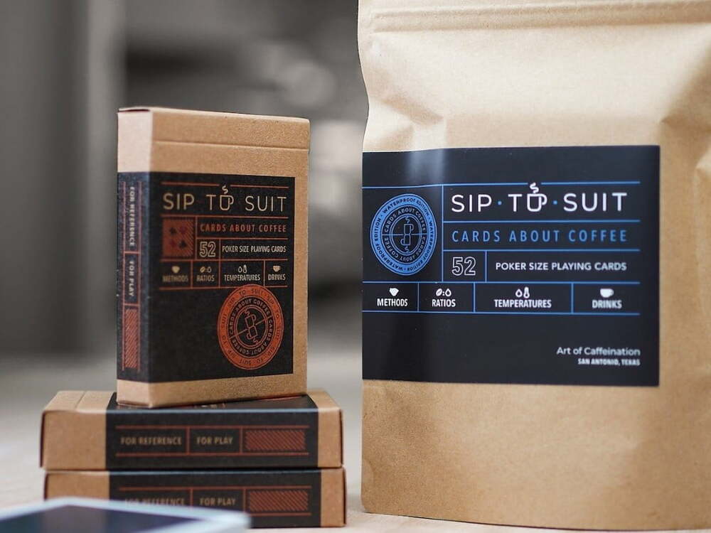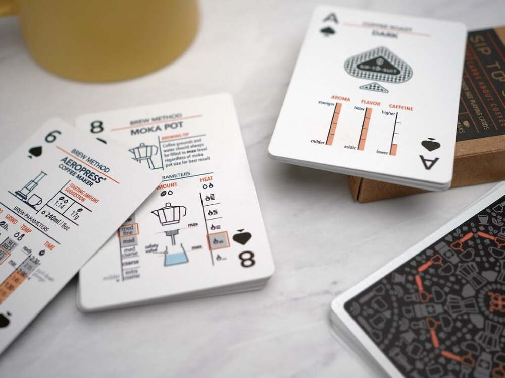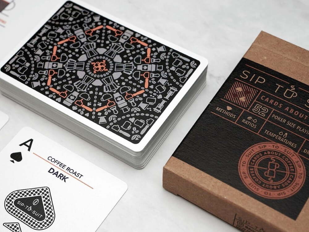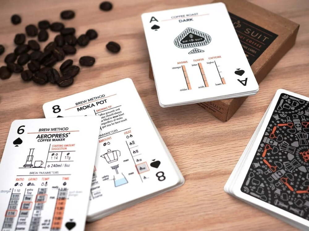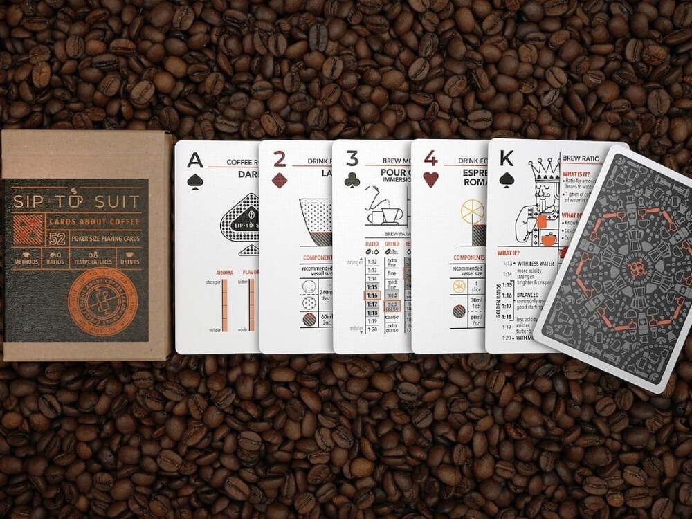 Sip-To-Suit Cards About Coffee, iskambil destesi olmasının yanı sıra iyi bir kahve yapmanın püf noktalarını veren bilgi kartları olarak işlev yapıyor. Kartlar; iyi kahve demlemenin sırları, farklı demleme makineleri ve farklı su miktarları, demleme süreleri ve öğütülmüş kahvenin ne kadar ince olacağı gibi detaylar içeriyor. Öyle ki yıllardır iyi kahve yapan biri olduğunuzu düşünseniz de merakla inceleyip bilgilerinizi gözden geçirebileceğiniz türden kartlar bunlar. Oyun oynarken hemen göz atılabilecek kadar basit ve okunması kolay bir şekilde sunulmuş bilgiler.