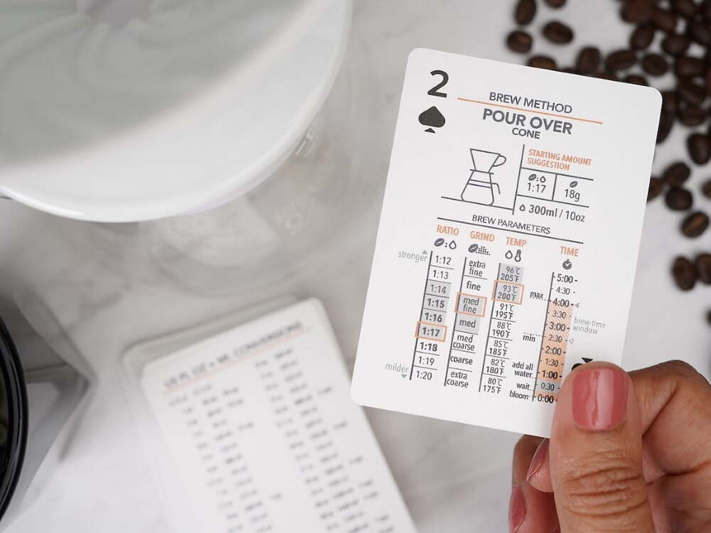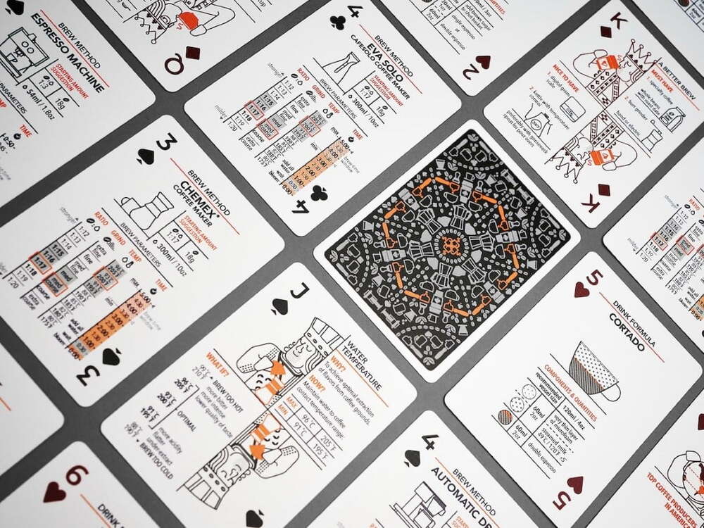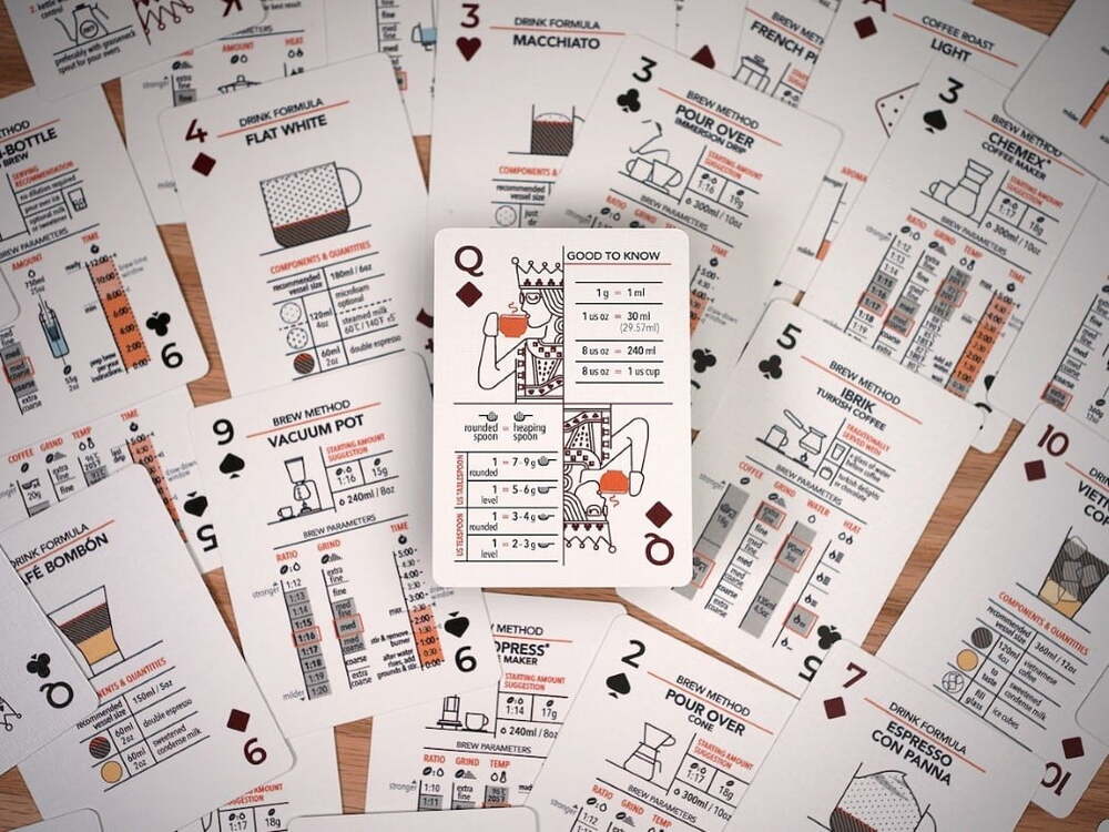 Yukarıda da bahsettiğim gibi bu deste, kahve hakkında pek bir şey bilmeyen heveslilerden espresso uzmanlarına uzanan geniş bir kitleye hitap ediyor. Desenli olan arka tarafları da kahve temalı illüstrasyonlarla bezeli. Deste, akıllıca kategorilere ayrılmış standart 52 kartlık bir set. Aslar kahvenin kavrulma seviyelerini ele alıyor. Siyah kral, kız ve vale demlemeyle ilgili temel bilgileri, kırmızı olanlar ise daha üst seviye demleme ipuçlarını içeriyor. Siyah sayı kartları, elde kahve demleme aparatından karmaşık kahve makinelerine uzanan tüm demleme tekniklerini içeriyor. Kırmızı sayı kartları ise menü kartları gibiler ve detaylı talimatlarla kılavuzluk eden 18 farklı kahve tarifi içeriyorlar.
