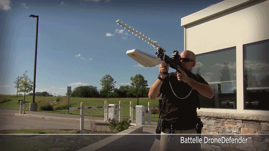 Tüm bu gelişmelerin üzerine Battelle Innovations‘ın geliştirdiği tüfek benzeri bir araç, bu düzenleme sürecinde teknolojiye zarar vermeden yere indirebiliyor. Yapılan basın açıklamasıyla beraber radyo dalgalarını kullanarak hava aracının daha ileriye gidememesini ve adeta telekinezivari kontrol ederek yere indiriyor. Düşük maliyetli, kolay kullanımlı, hafif ve nişan alıp ateşlemeli mekaniğiyle DroneDefender, 30 derece açıyla nişan alınan 400 metre içindeki her araca erişebiliyor.