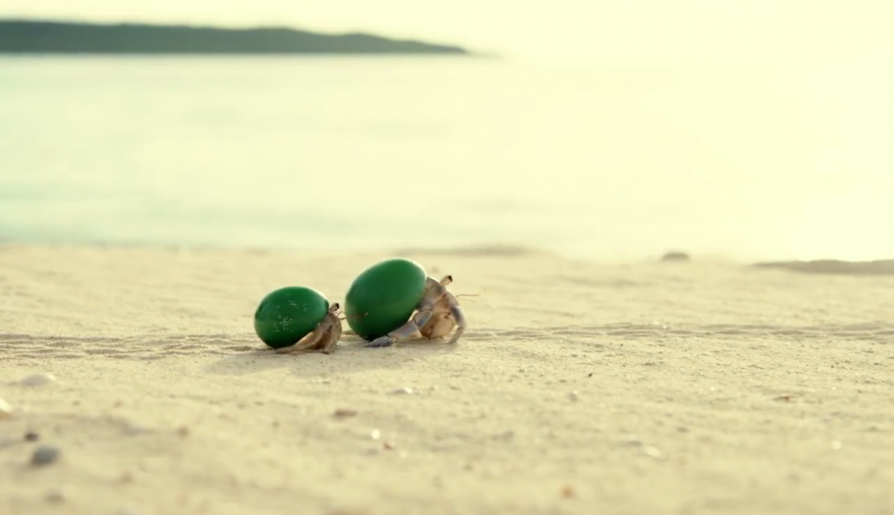 Suumo’nun “Shell We Move?” isimli kampanyası, ömürleri boyunca kabuk değiştirip bedenine en uygun evi arayan yengeçleri için hazırlandı. Keşiş yengeçlerinin beğenisine sunulmak üzere sahildeki kumlar üzerine bırakılan koza şeklindeki yuvarlak yeşil kabuklar, bilgisayar ortamında tasarlandı ve tamamen doğal, geri dönüşebilir bir materyal olan patates nişantasıyla üretildi.