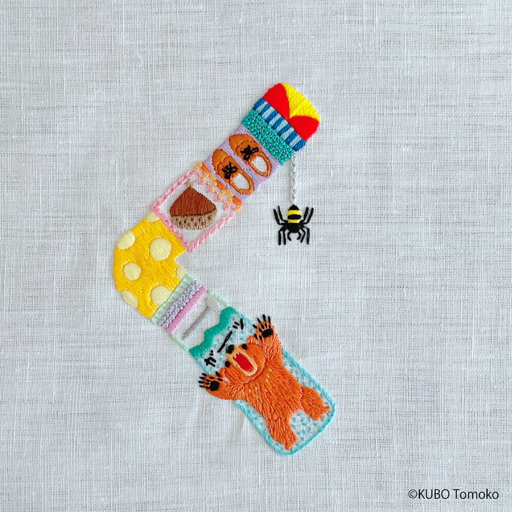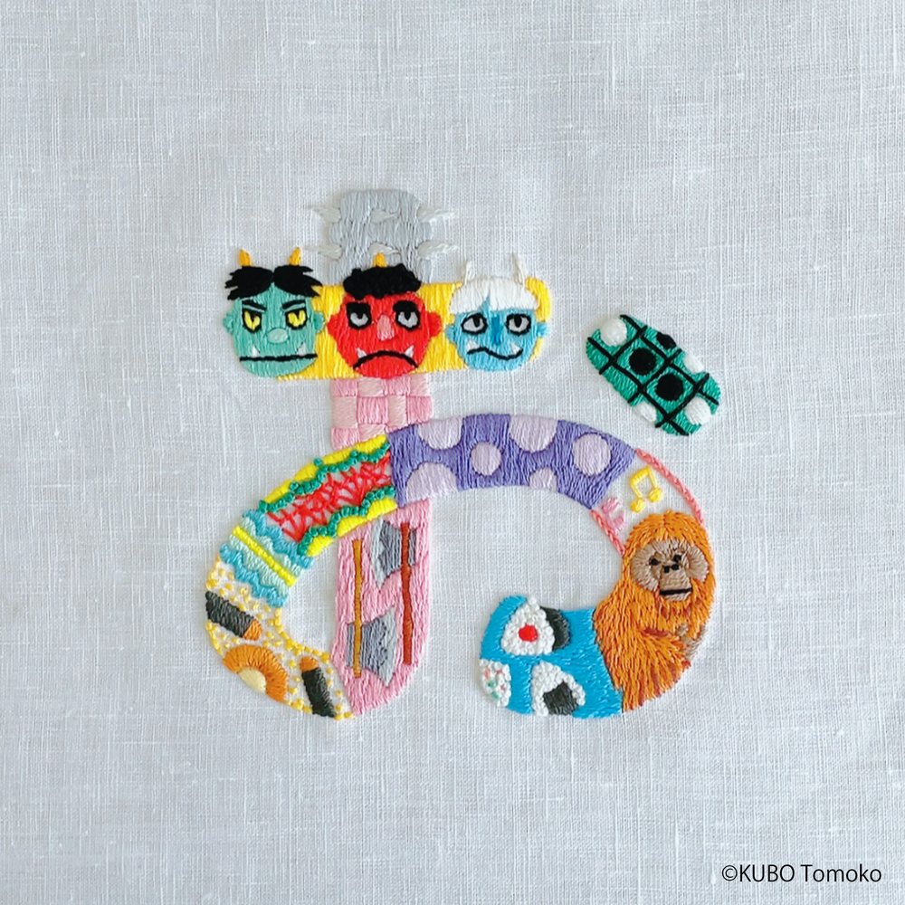 Hiragana karakterlerine karşılık gelen hecelerle başlayan kelimelerin görsel temsillerini içeren nakış işleri, Tomoko Kubo’nun temel odağı.